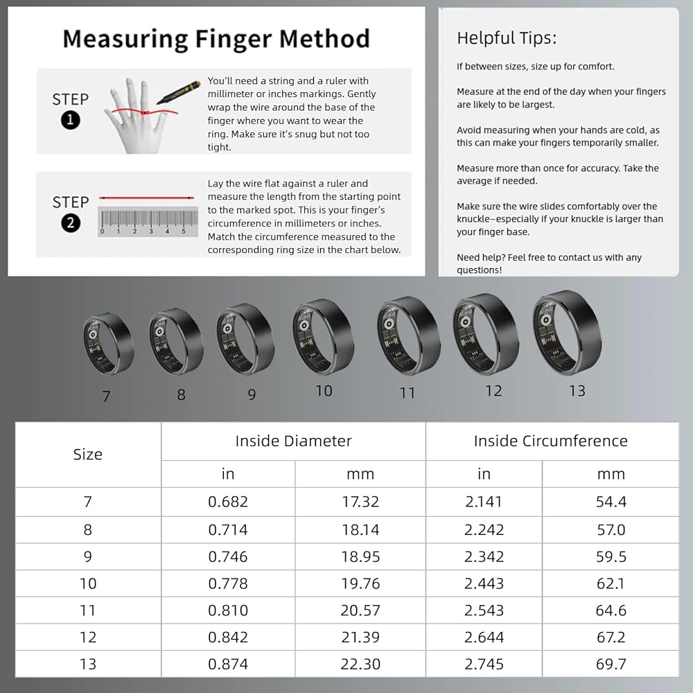 【الحجم قبل شراء】 قبل شراء الحلقة الذكية ، نوصي بشدة بالإشارة إلى الرسم البياني الحجم وقياس محيط إصبعك لضمان الملاءمة الأكثر راحة وتجنب العوائد أو التبادلات غير الضرورية