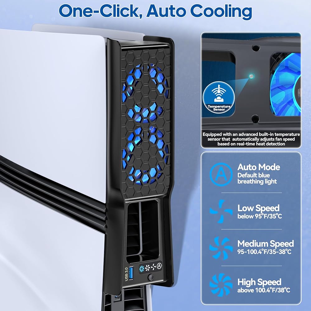 نظام تبريد المروحة العالي - الكفاءة PlayStation 5: تبرد مروحة تبريد PS5 بسرعة PS5 Slim/Pro. تبريد Scry Arctic لـ PS5 Slim/Pro ، وحدة تحكم PS5 Slim/Pro من ارتفاع درجة الحرارة ، وضمان تشغيل مستقر وإطالة عمر الأجهزة. بالإضافة إلى ذلك ، يعزز مروحة التبريد PS5 Slim تجربة الألعاب الخاصة بك عن طريق منع عمليات الإغلاق غير المتوقعة.