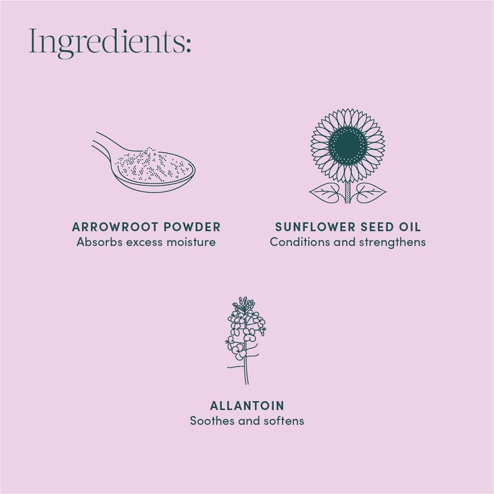 TALC-FREE AND PLANT-BASED: Talc-free, soft-touch liquid baby powder that effectively dries and moisturizes through plant-based ingredients like allantoin, arrowroot powder, sunflower seed oil and coconut oil.