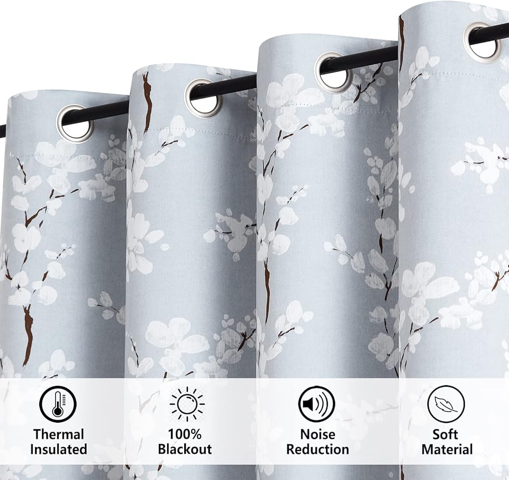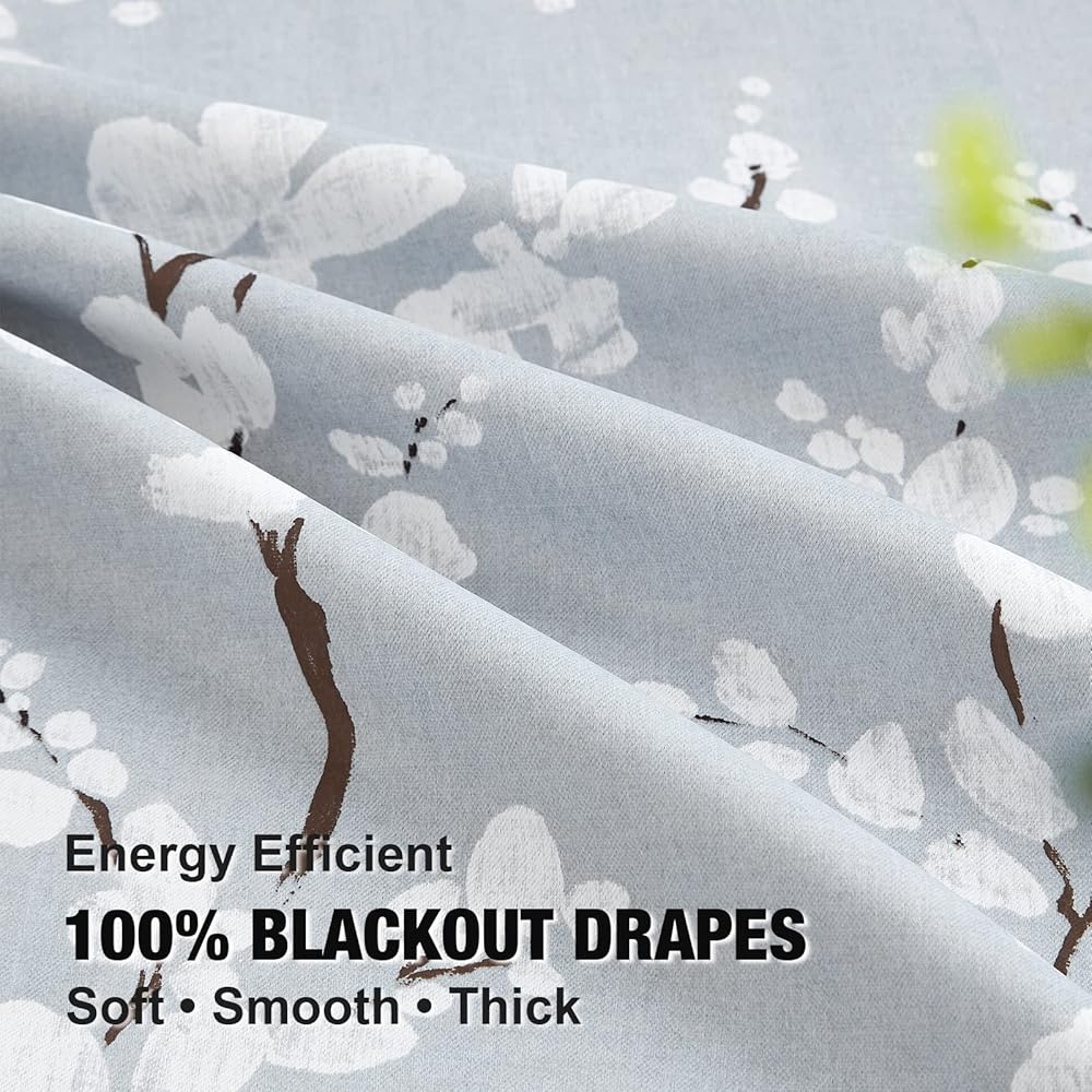 ❀ستائر التعتيم الزهرية: زهور بيضاء مزهرة مع فروع بنية مطبوعة على ستائر معتمة رمادية فاتحة، تساهم في سحر الألوان المائية لألواح الستائر هذه، مما يوفر إحساسًا بالريفي والجمال.