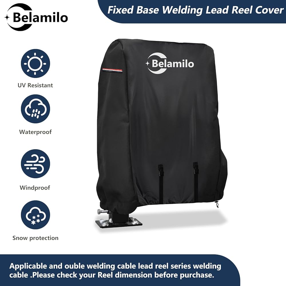 Easy to fasten: The bottom of Belamilo welding lead reel cover has desigend elastic hem cord and 2 fixed buckle straps.It can be adjusted to achieve a tight custom fit.Adjustable hem cord with click-close straps provides the reel cover a customizable fit with exceptional security in the windy day