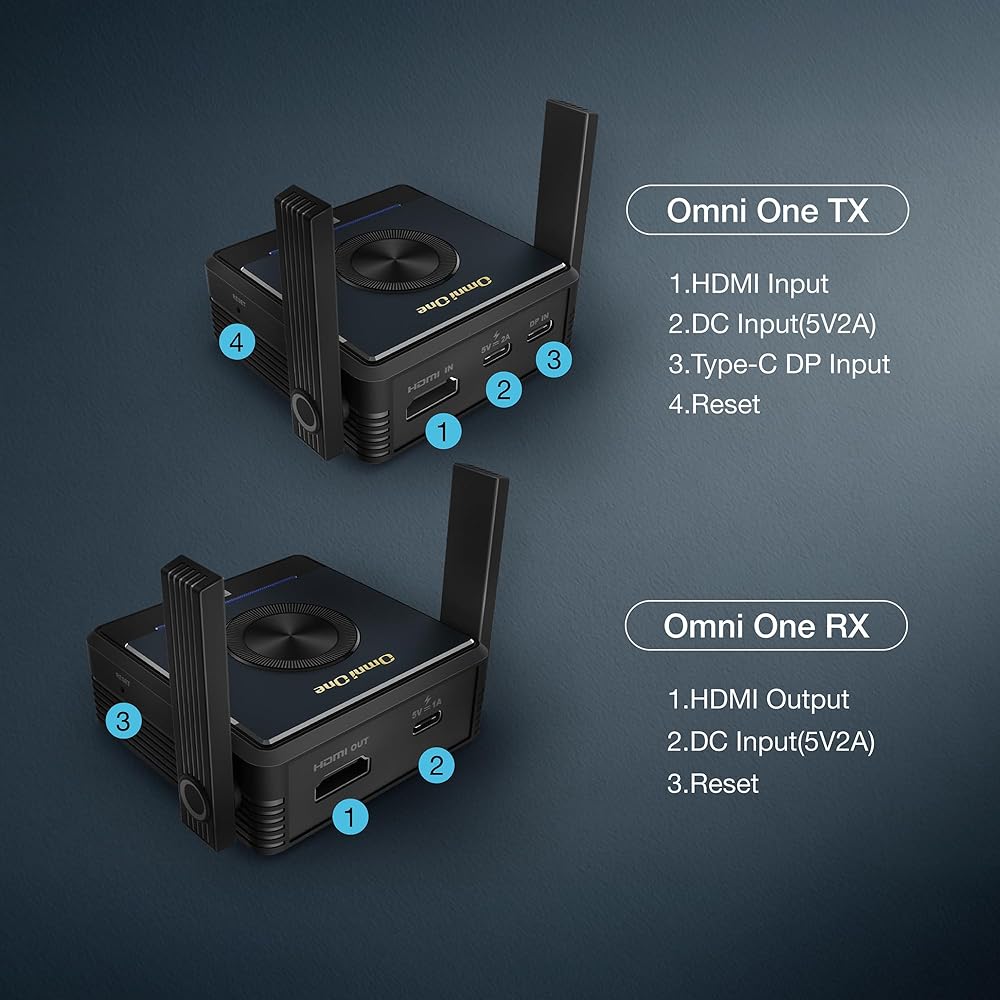 Ezcast Omni One Wireless HDMI Extender - ينقل عبر الحواجز ، هوائي مزدوج مع 5 جيجا هرتز Wi -Fi ، <60 مللي ثانية زمن انتقال ، يدعم ما يصل إلى 4 مستقبلات ، HDMI و USB - C/DP