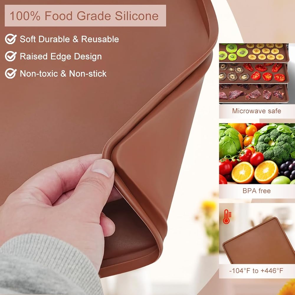 Premium Material - The dehydrator trays are made of Premium 100% BPA Free natural Silicone Design, Safely, Non-toxic, Non-stick, won't deform when heated, and easy to clean and reusable. Note: Soft Dehydrator Sheets cannot be used alone, and must be placed on a hard tray before serving food. Besides it is easy to change shape and the food is easier to remove, so please take off carefully.