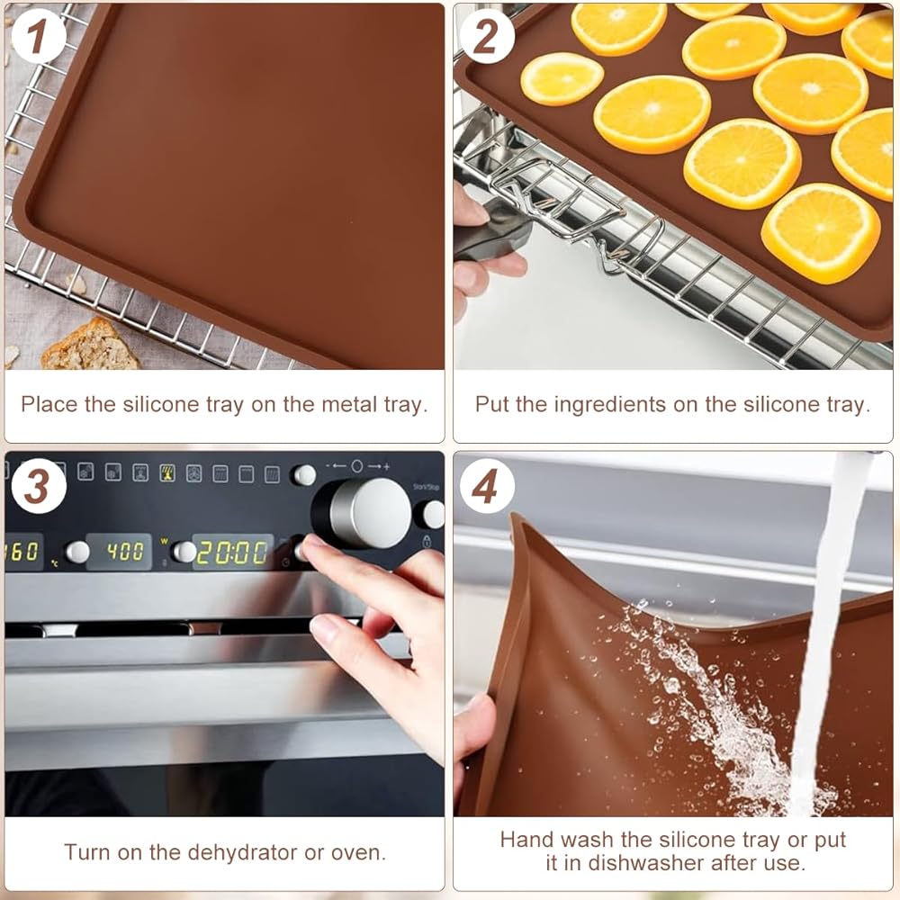 Large Capacity - Our Silicone Dehydrator Tray measures is 14" x 14", Suitable for Excalibur Dehydrator and more. The temperatures ranging from -40 °F to 500 °F,Just make sure that the size of the metal tray is larger than that of the silicone tray and you can use it. Note: Since the silicone is soft and cannot be used alone, it should be placed on a metal tray before serving.