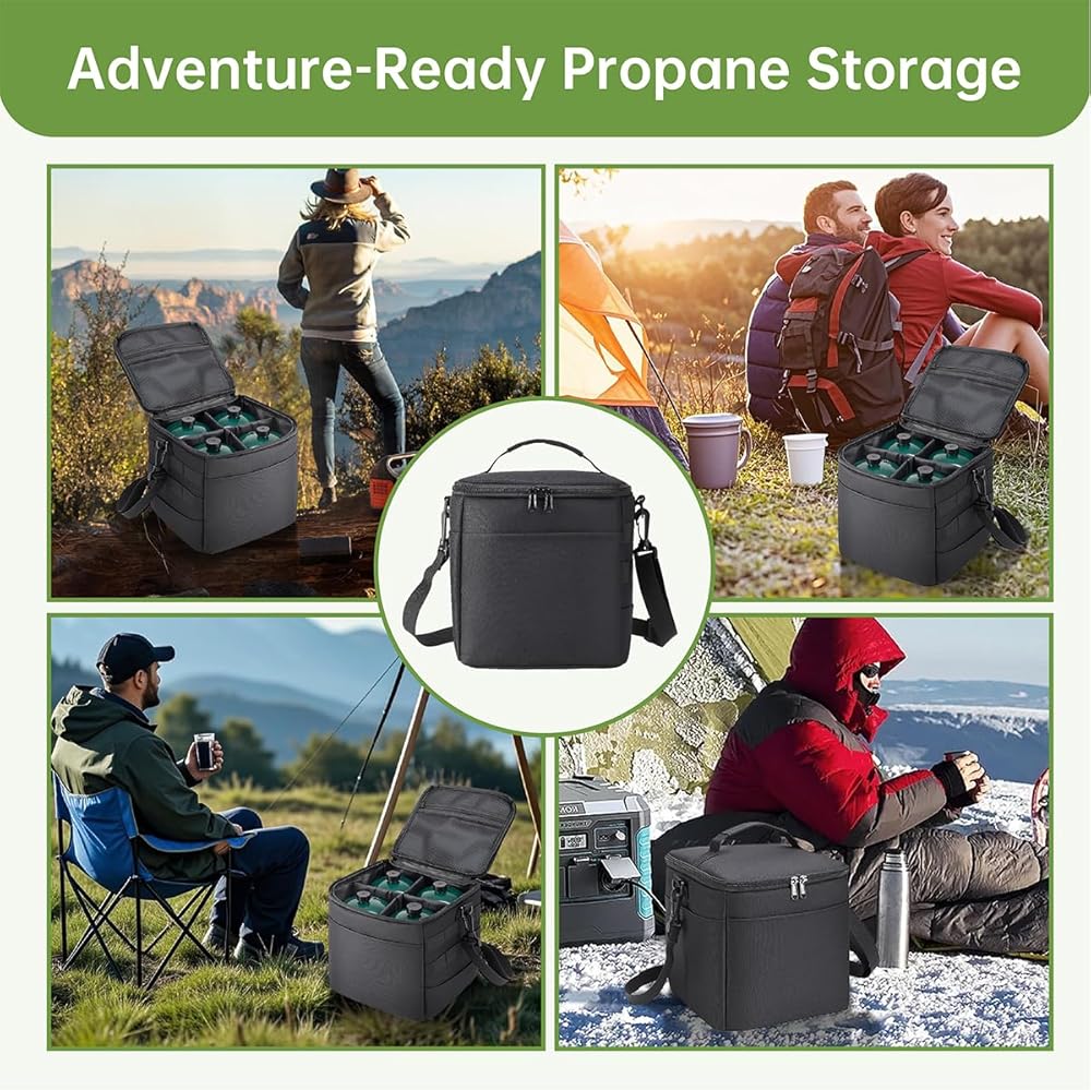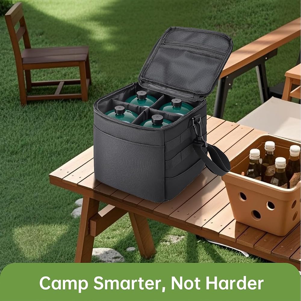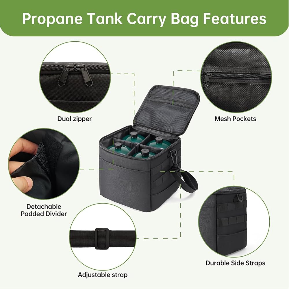 منظمة ذكية ذات 4 أسطوانات: تتميز مقاطعات إسفنجية قابلة للإزالة وجيوب شبكية لتخزين ما يصل إلى أربعة من علب البروبان 1 رطل ، مما يمنع تشكيل المعادن على المعادن أثناء النقل