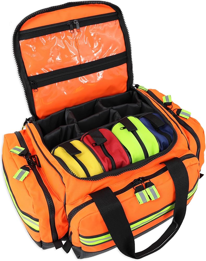 [Dims + Colors]: تتوفر حقيبة الصدمات MB35 EMT في اختيارات الألوان البرتقالية الحمراء والأسود والأزرق والفلورسنت. يبلغ قياس الكيس 20 "(L) × 15" (W) × 10 "(ح) عند إغلاقه