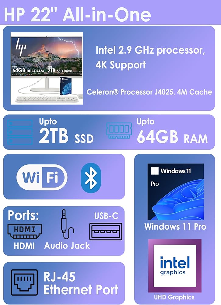 Processor: Intel Celeron J4025 (2.0 GHz base frequency, up to 2.9 GHz, 2 MB L2 cache, 2 cores) Display: 21.5" diagonal, FHD (1920 x 1080), VA, three-sided micro-edge, anti-glare, 250 nits, 72% NTSC ||. Webcam: HP True Vision 720p HD privacy camera with integrated dual array digital microphones||. Operating system: Windows 11, 64-bit, English||. Memory: upto 64GB DDR4 SDRAM||. Hard Drive: upto 2TGB PCIe SSD||. Keyboard: US English, Full Size Keyboard with numeric keypad||. Ports: 2 SuperSpeed USB Type-A 5Gbps signaling rate; 2 USB 2.0 Type-A; 1 USB Type-C 5Gbps signaling rate; 1 HDMI-out 1.4; 1 headphone/microphone combo; 1 RJ-45||. Connectivity: Wi-Fi 6 and Bluetooth||. Color: white||. Dimensions L x W x H (inches): 19 x 12 x 15 in||. Weight: 7 lbs||.