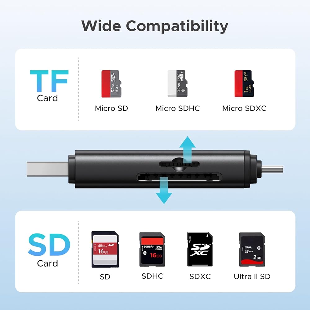 التصميم 2-in-1: يمكن توصيل قارئ بطاقة USB C SD بسهولة بجهاز الكمبيوتر والهاتف المحمول عبر واجهة USB A أو USB C. تدعم الفتحتان SD ، SDHC ، SDXC ، Micro SD ، Micro SDHC ، Micro SDXC بطاقات تصل إلى 2 تيرابايت وتسمح لك بقراءة بطاقتين في وقت واحد