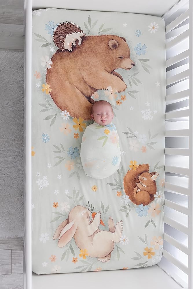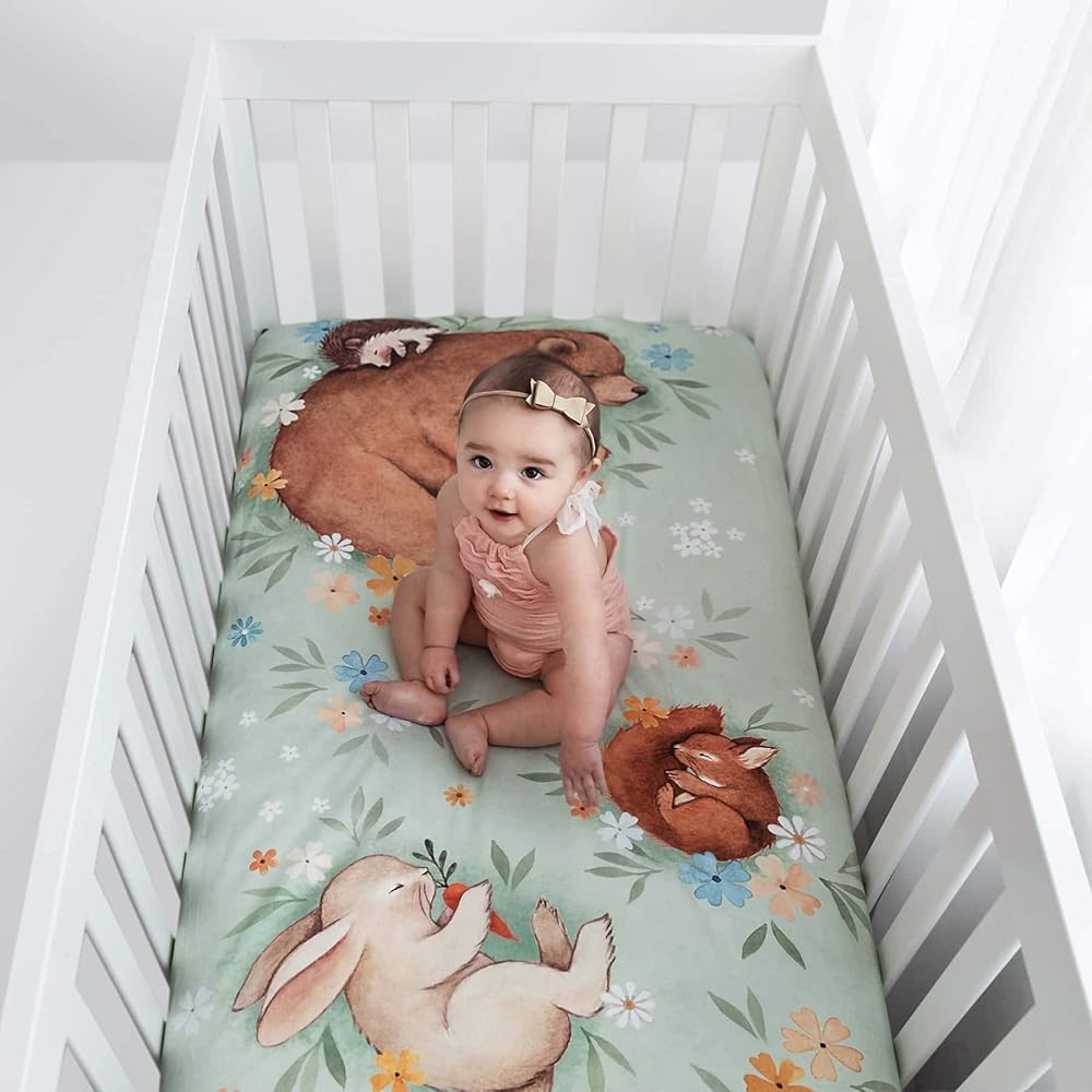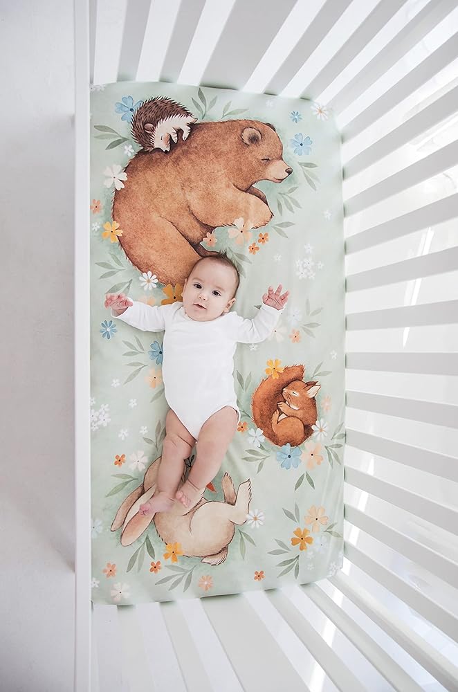 A watercolor meadow of blooms and woodland friends creates the sweetest backdrop for your little one's dreams. Rookie Humans crib sheets are designed to create beautiful and creative backdrops for babies. Each sheet is illustrated to be like a page in a storybook where baby is the protagonist. Soft to the touch, sleeping on our 100% cotton sateen crib sheet is a dream. Our high-quality fabric is made of 230 thread count and a sateen weave, which is known for its smooth and lustrous finish. Because we care about your little ones, the Enchanted Meadow crib sheet is OEKO-TEX certified and carefully crafted without harmful chemicals.