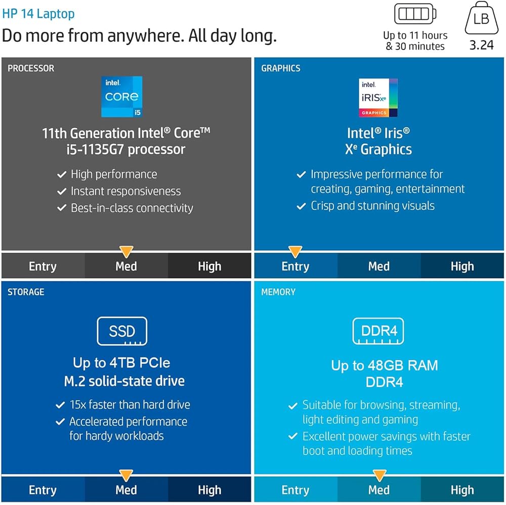 كمبيوتر محمول HP 14 بوصة فائق النحافة | معالج Intel Core i5 (يصل إلى 4.2 جيجا هرتز) | ذاكرة وصول عشوائي DDR4 سعة 8 جيجابايت | محرك أقراص PCIe SSD سعة 256 جيجابايت | Windows 11 | قارئ بطاقة SD | HDMI | WiFi وبلوتوث | عمر بطارية يصل إلى 11.5 ساعة للعمل والد