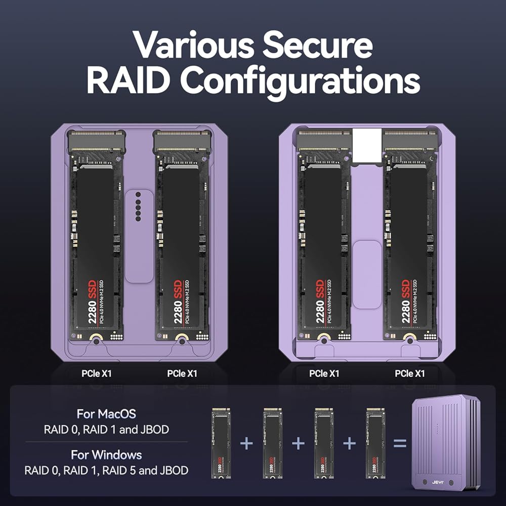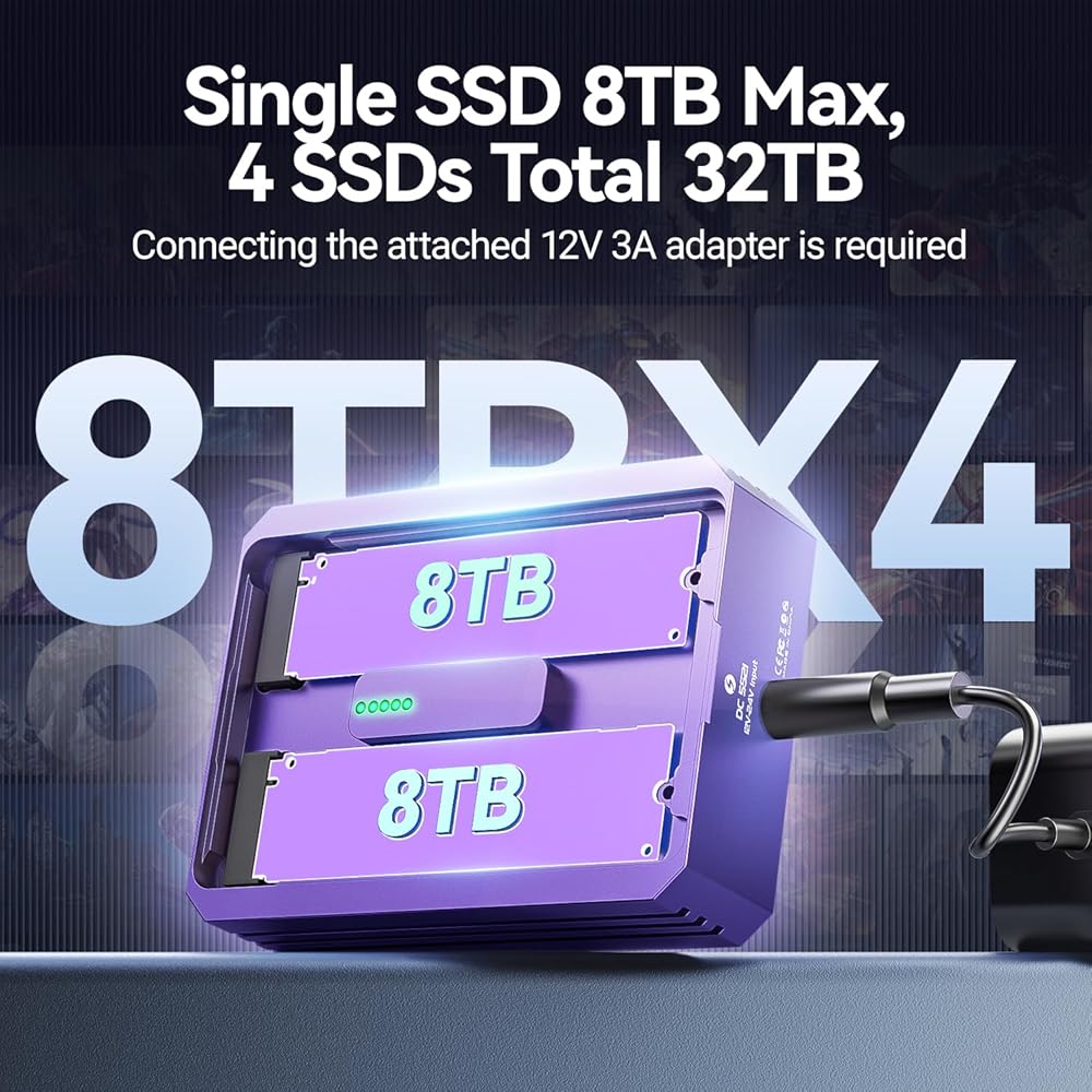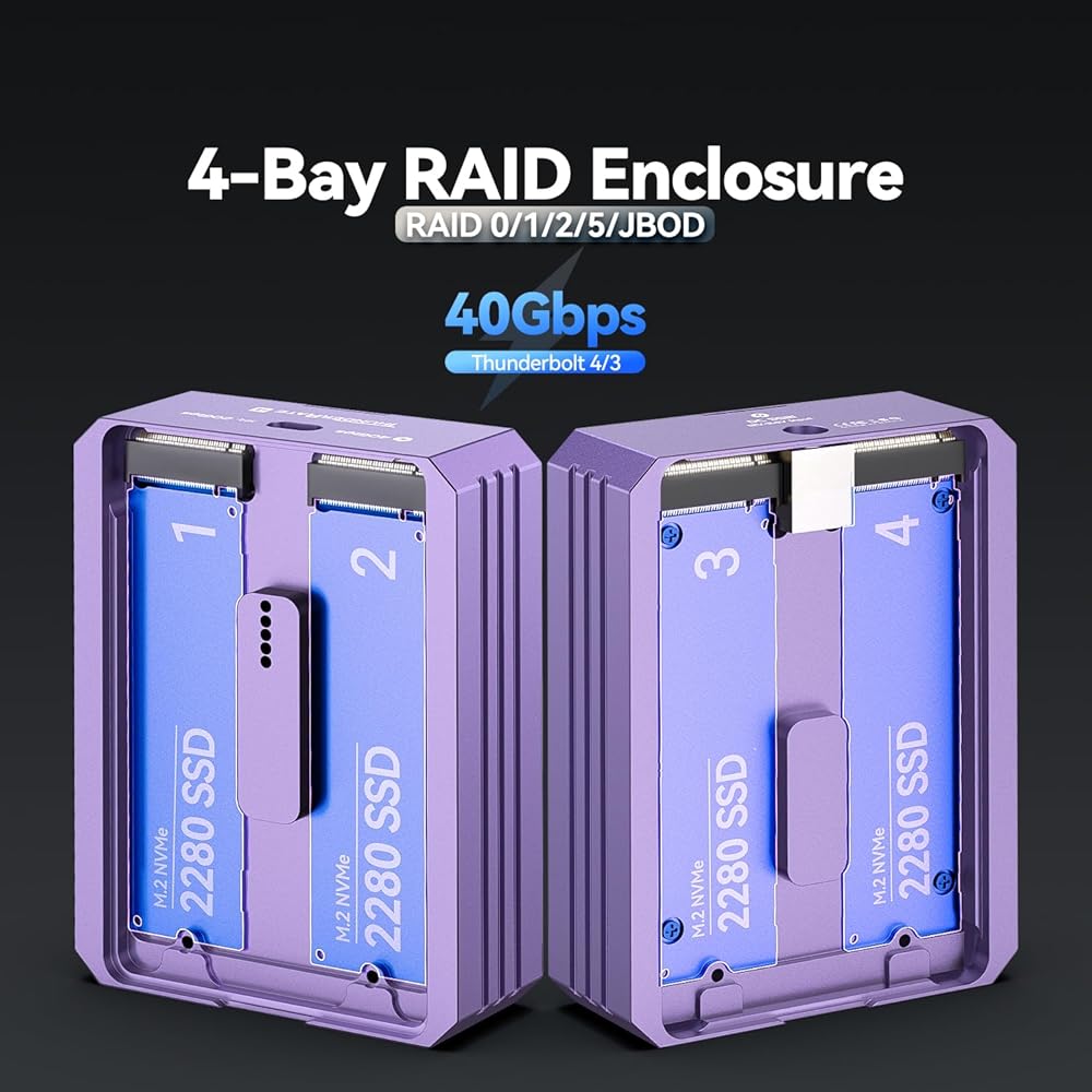 إن تركيب أربعة SSDs NVME في حاوية Jeyi Quad NVME RAID ، التي تدعم USB 4 بسرعة 40 جيجابت في الثانية ، يوسع قدرتها إلى 8 تيرابايت. يدعم 4 M.2 SSDs تصل إلى 32 تيرابايت. متخلف متوافق مع Thunderbolt 3/4