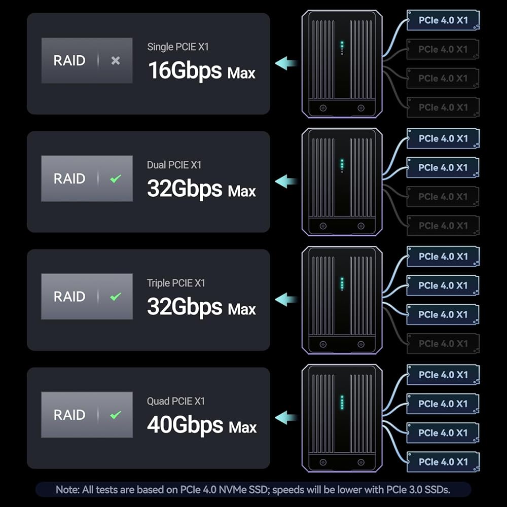 يدعم أربعة SSDs NVME ، مع كل عرض النطاق الترددي الحصري PCIe 3.0 X1. تشترك SSDs الأربعة في عرض النطاق الترددي PCIe 3.0 X4 (USB 4 و Thunderbolt 3 في 40 جيجابت في الثانية)