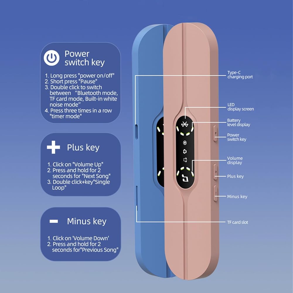 ضوضاء وتوقيت بيضاء مدمجة: يأتي مكبر صوت الوسادة الخاص بنا مع مولد ضوضاء أبيض مدمج ، مما يتيح لك الاختيار من بين مجموعة متنوعة من الأصوات المهدئة-بما في ذلك أصوات الطبيعة والألحان المهدئة-لإنشاء بيئة نوم سلمية خاصة بك. بالإضافة إلى ذلك ، تتيح لك وظيفة المؤقت تعيين مدة محددة لتشغيل الضوضاء البيضاء ، مما يمنع استهلاك الطاقة غير الضروري مع إعطاء أذنيك راحة أثناء ساعات النوم.