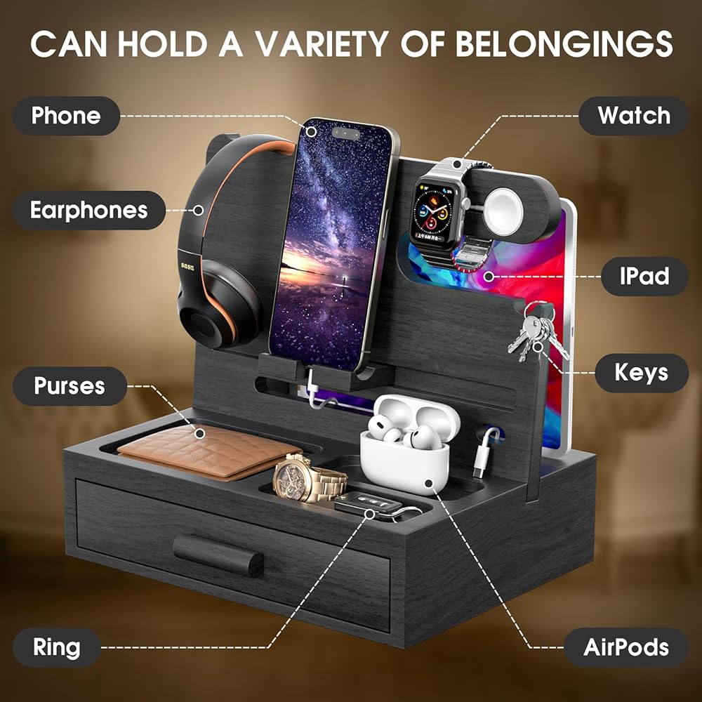 • المساحة المنظمة: تساعد محطة إرساء الهاتف هذه على التخلص من الفوضى من خلال تنظيم أجهزة الشحن والعناصر اليومية. تضمن الفتحات والمقصورات المصممة بعناية أن يكون لكل عنصر مكانه المناسب ، مما يقلل من الاضطراب ويسهل تحديد موقع ما تحتاجه