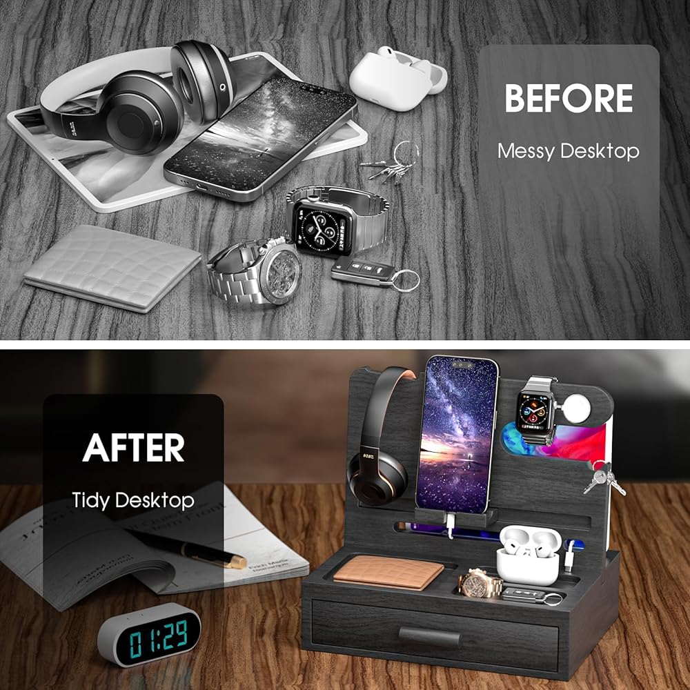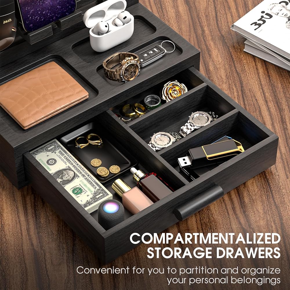MELAFA365 منظم منظمت منضدة للرجال ، منظم محطة إرساء الهاتف مع إدارة الكابلات ، منظم الوقوف الليلي مع درج ، منظم بجانب السرير للساعات ، المفاتيح ، المحافظ ، الهدايا للرجال (أسود)