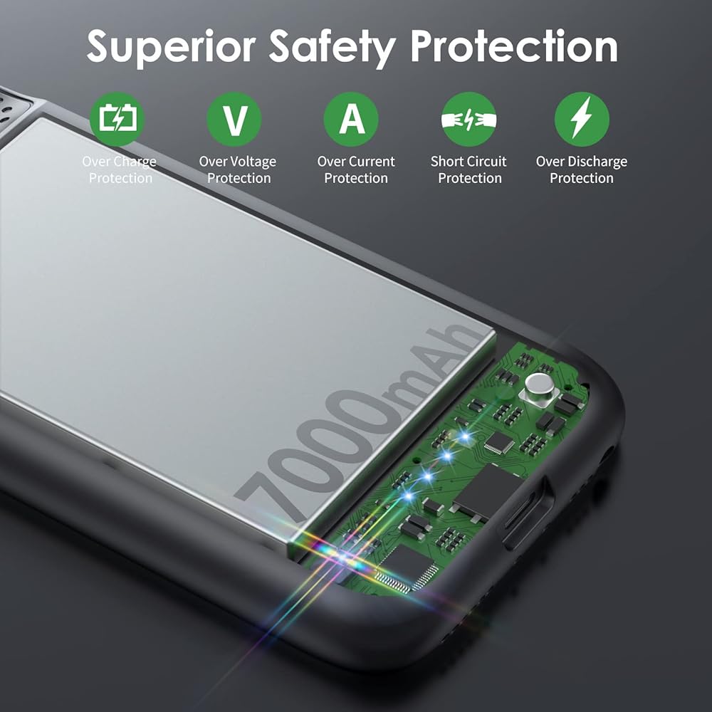 【Charging & Protection 2 in 1】This battery case certificated by UL,CE,FCC,Rohs. Integrated circuit protect your iphone from overcharging,overheating, over-current, short-circuit. It's bumper and hard shell back design offers complete protection for your iPhone from scratches, daily wear and tear. Raised bezels and Tempered Glass screen protector offer broadside and surface protection. It combines a power bank and a protective case.