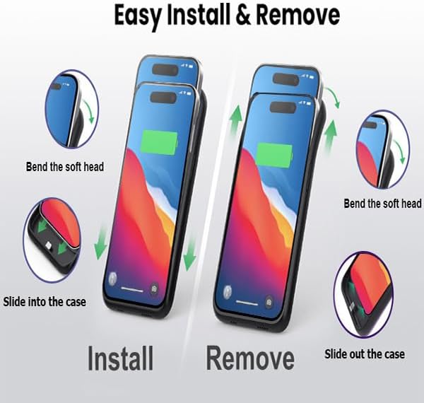 【Upgraded Soft Top TPU Materia】The upgraded part makes installation and charging effortlessly. ★Just bend the top TPU soft adhesive slightly back, and then insert the phone vertically into the back clip battery from the top, then press iPhone Battery Case the power button 3 seconds, start or stop charging for your iPhone. 4 LED indicator lights clearly show the current battery levels (25%-50%-75%-100%).