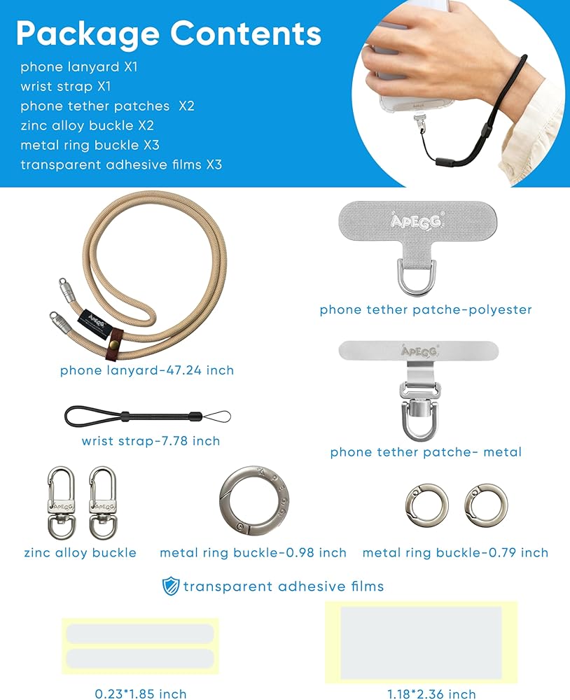 【Package Contents & 30-Day Returns】47.24-inch phone lanyard X1、7.78-inch wrist strap X1、phone taps X2、 25mm metal ring buckle X1、 20mm metal ring buckles X2. –We offer a 30-day replacement or refund for any damaged lanyards.