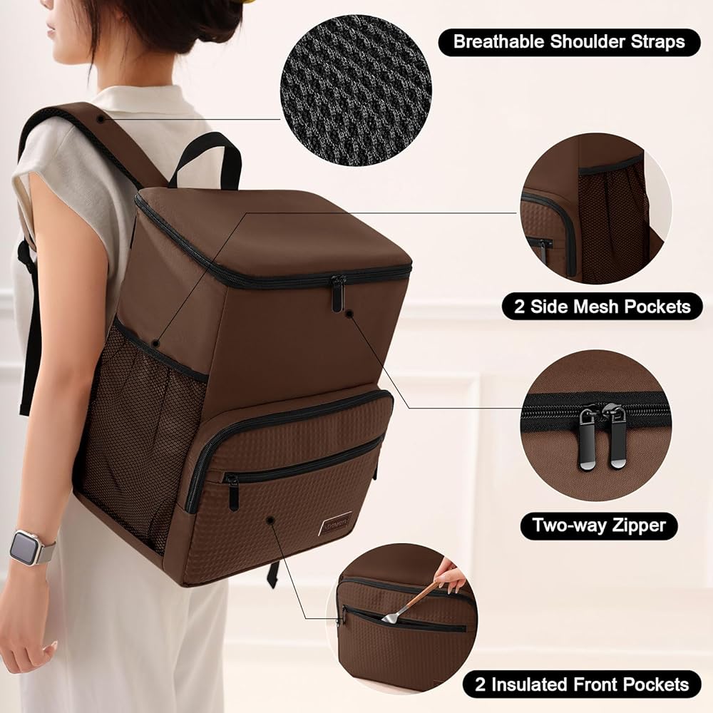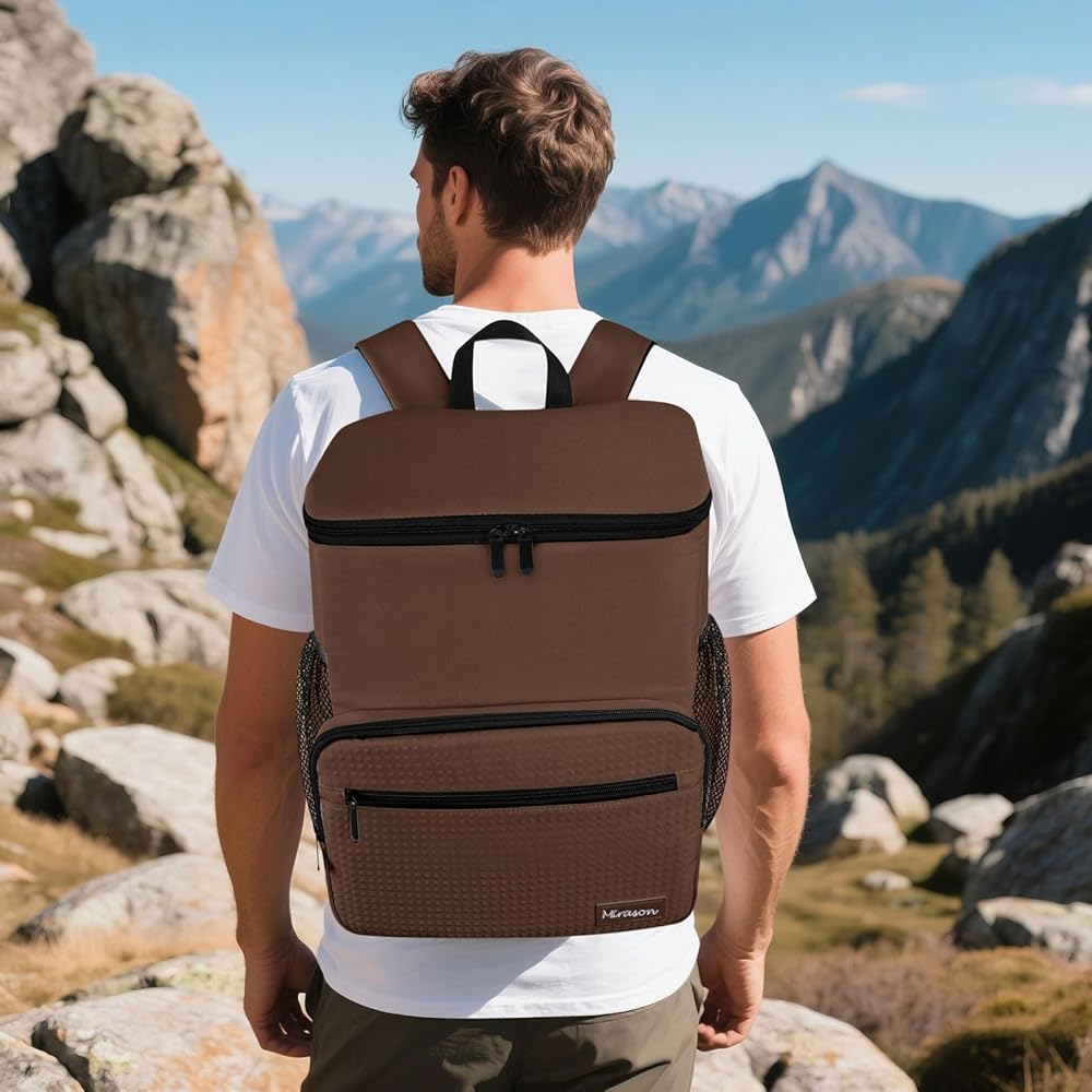 Spacious Storage Capacity: With a large main compartment to hold ice, beverages, or lunch boxes, two front zipper pockets for essentials like your phone or wallet, and two mesh side pockets for water bottles, this insulated backpack is built for convenience. Easily pack your favorite beers, snacks, or even a full lunch with room to spare
