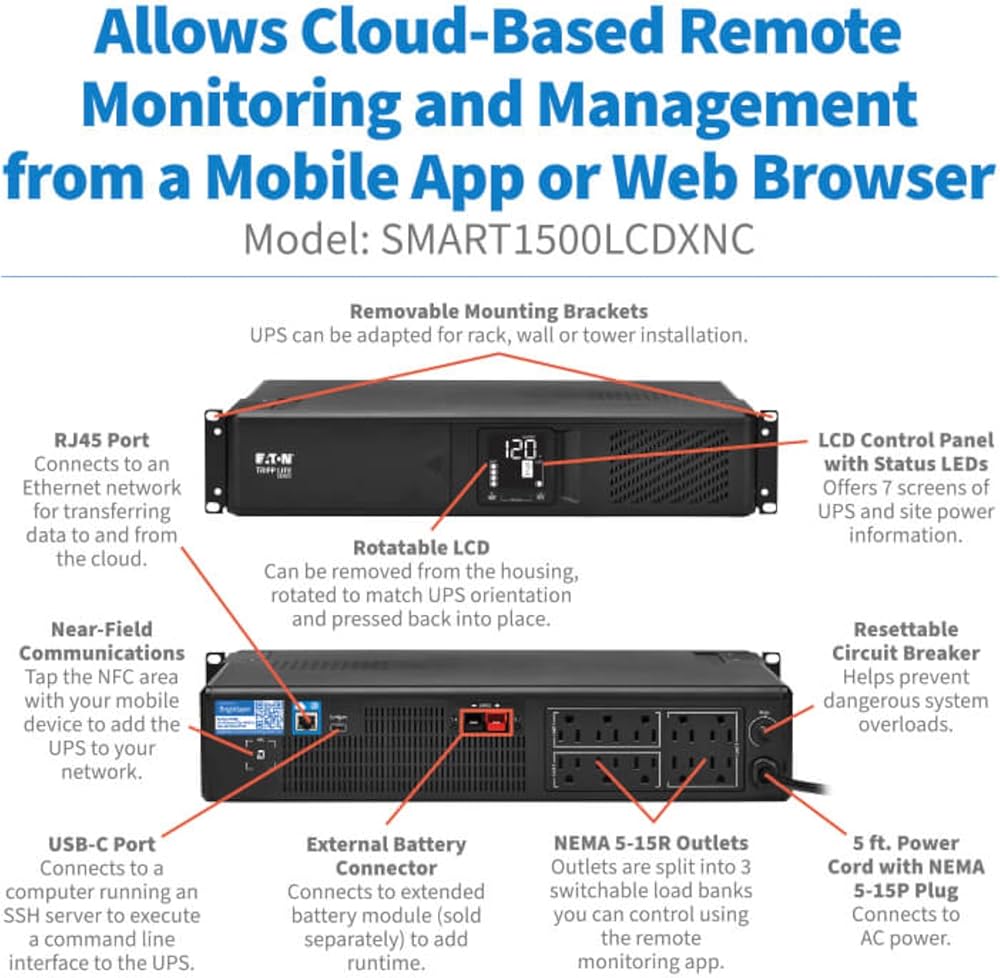 The SMART750LCDNC line-interactive cloud-connected UPS system combines cloud connectivity, remote management and advanced protection features. Its flexible form factor is suitable for desktop or floor placement, under desks or workstations, mounted on a wall or installed in 2U of space in a 2-post or 4-post rack. It's recommended for home, office and retail use, as well as network closets in both local and remote locations. The internal battery can be easily user replaceable with two of .