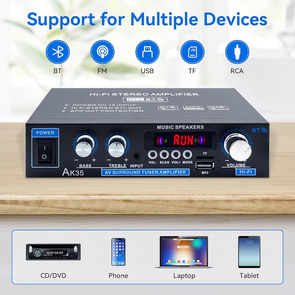 [اتصال Bluetooth] جهاز استقبال ستيريو AK35 مع شريحة Bluetooth 5.0 المدمجة ، اتصال Bluetooth مع عدم وجود الملوثات العضوية الثابتة ، لا ضوضاء ، إقران سهل ، يتصل بسهولة بالهواتف الذكية والأجهزة اللوحية وأجهزة Bluetooth الأخرى مباشرة بعد تشغيل الجهاز ، يحافظ على اتصال مستقر في غضون 30 قدمًا/10 أمتار.
