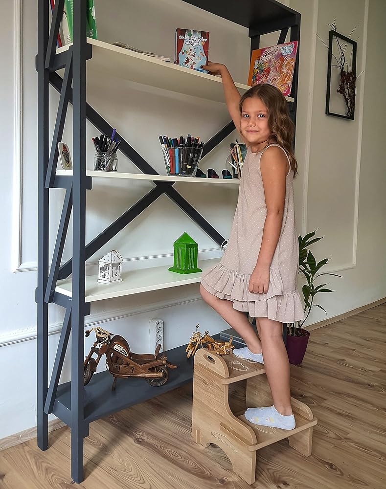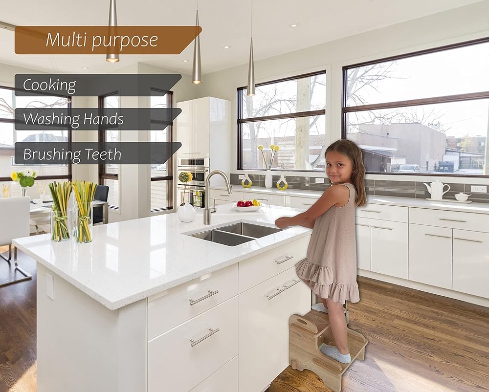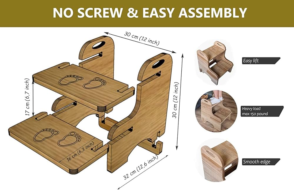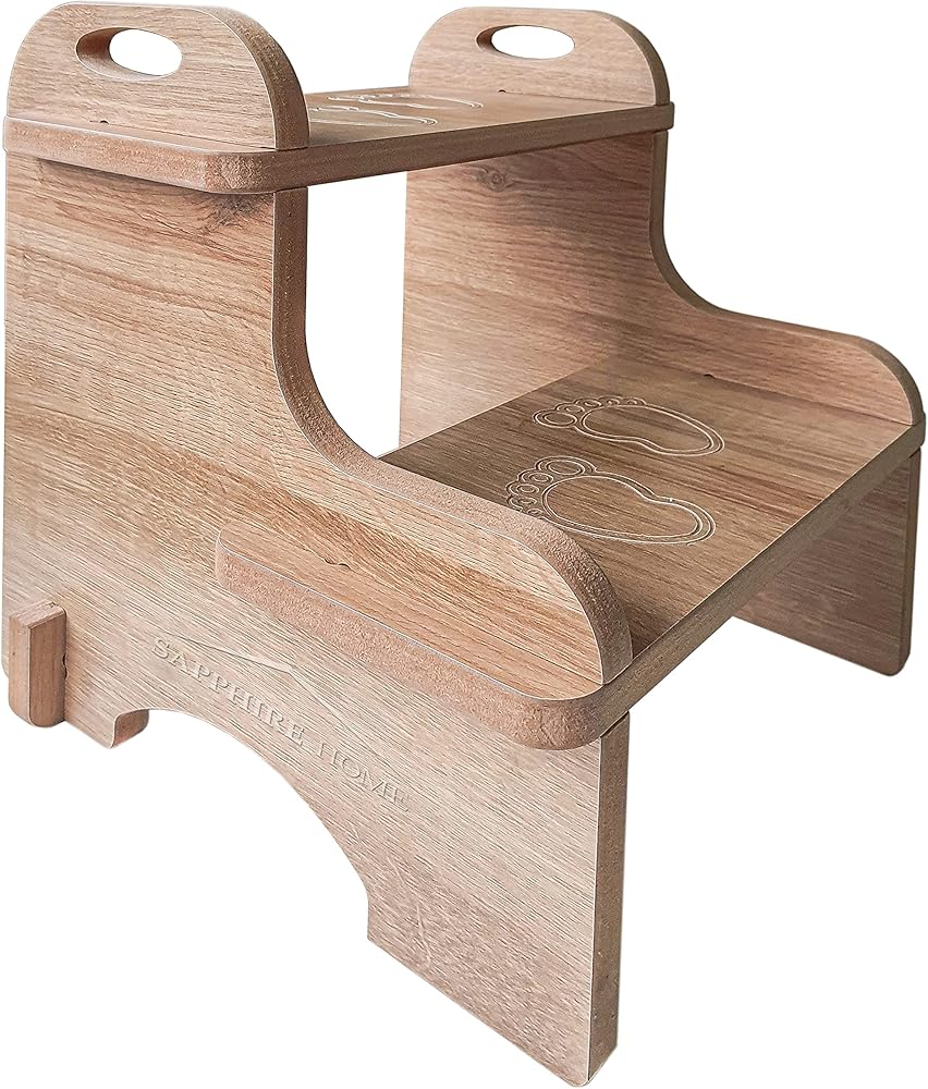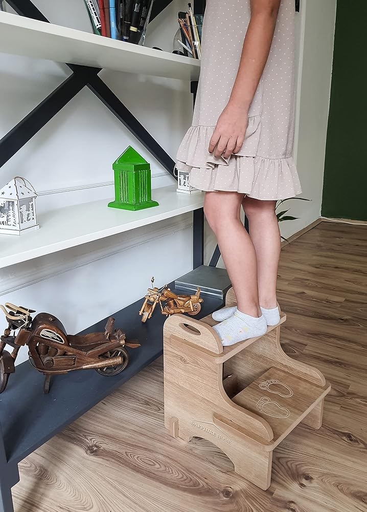 استخدام متعدد الأغراض: بفضل المقابض اليدوية، يمكن لطفلك وضع المنتج واستخدامه بمفرده أمام الحوض أو خزانة الألعاب أو أي مكان يريده. يمكن أيضًا استخدام مقعد الدرج الخشبي للتدريب على استخدام المرحاض.