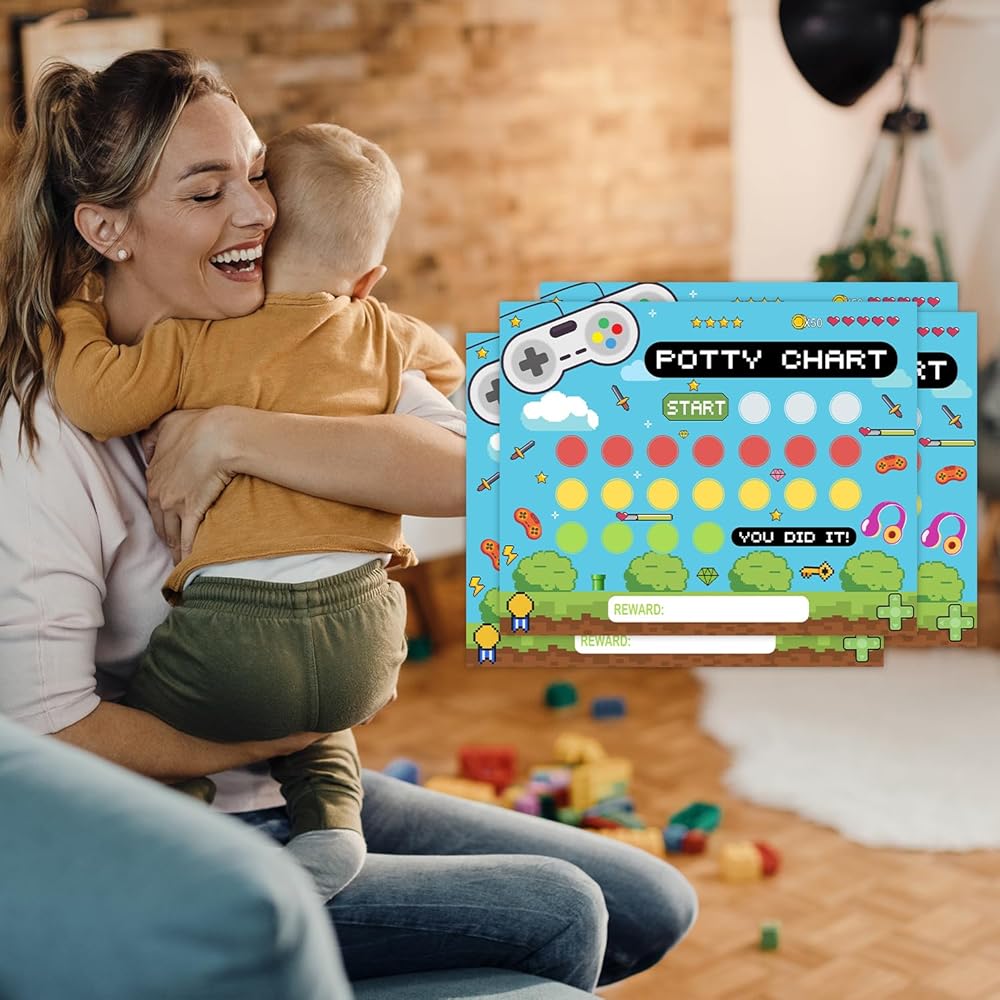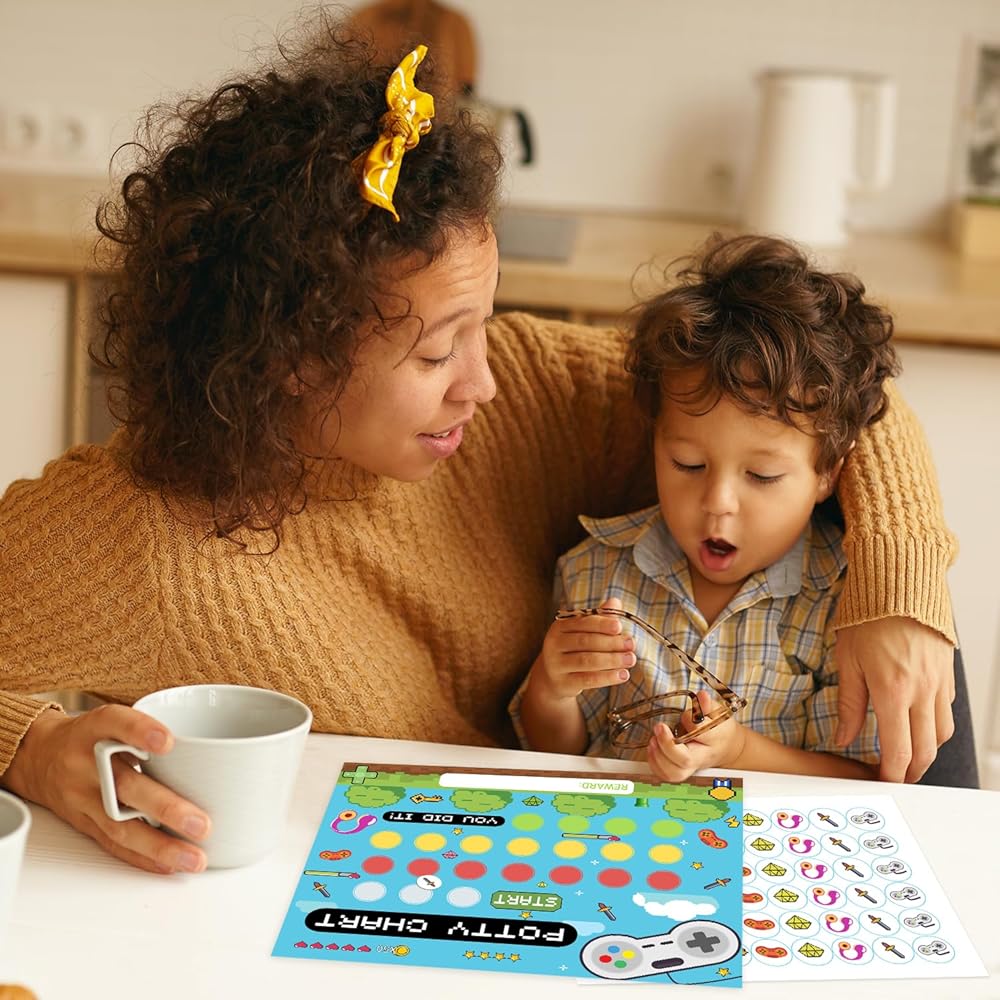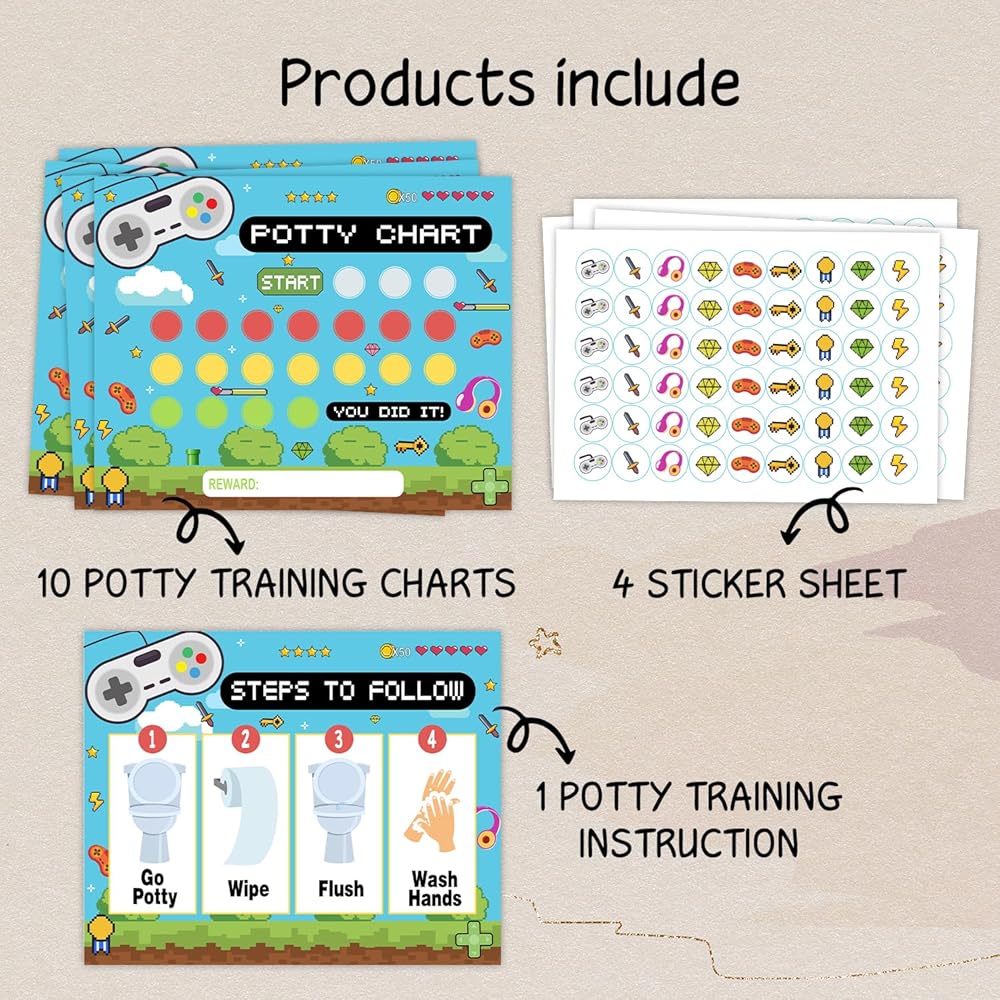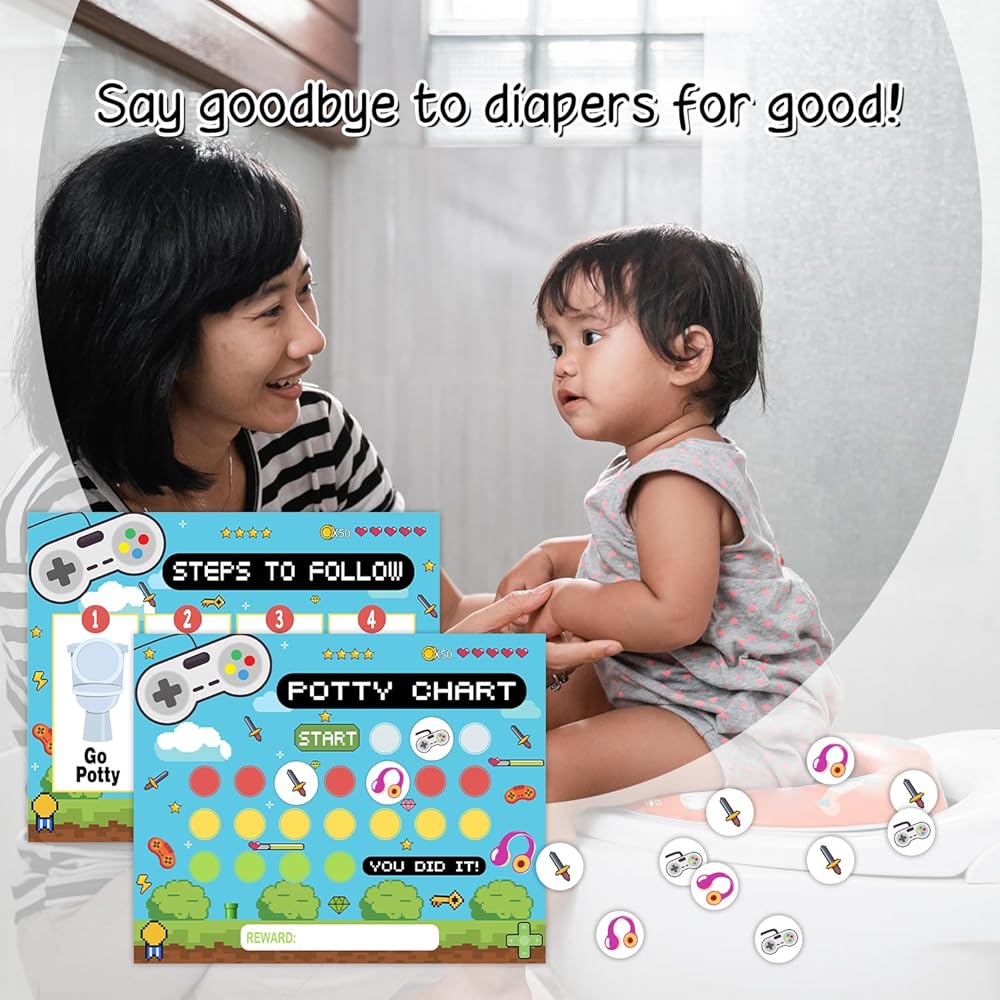 • Design: Our potty training chart has a fun design that will hold your child's attention. This potty sticker chart set makes tracking progress easy and motivating, turn potty time into a game with this potty training chart for toddler girls/boys.