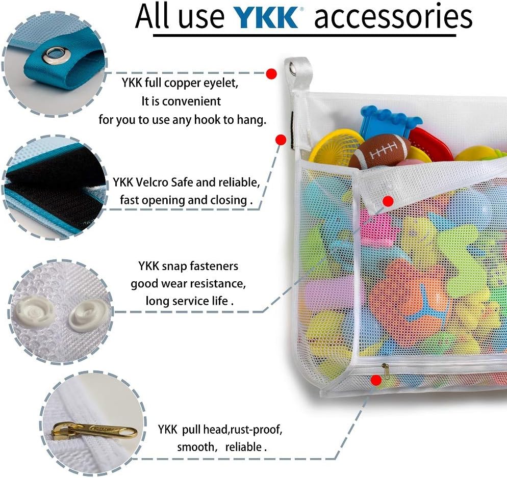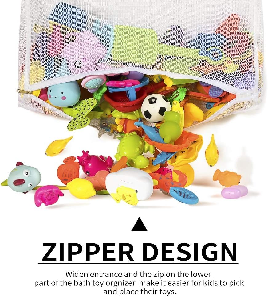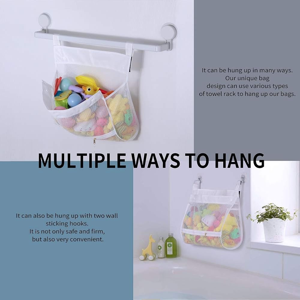Are you ready to take the mess out of bath time Kids love bath time with toys, but as you know, the bathroom usually ends up looking like a warzone - covered in toys and water! Well, the good news is, our mesh toy net is the bath organization solution there is! bathtub organizer creates opportunities for your little one to learn how to keep his / her toys after each bath session, encouraging your little one to organize their toys everyday, cultivating a good habit as well as imparting them the importance of organization in their lives! It keeps toys dry and clean too Because of all the water, bath toys can end up getting all slimy and gross when kept lying around or in a basin. But because our netting is specially spaced out, there is plenty of room for air to circulate while all the water drains out leaving toys clean and dry with no mess! (Product inclusion 4 Ultra Strong Hooks)