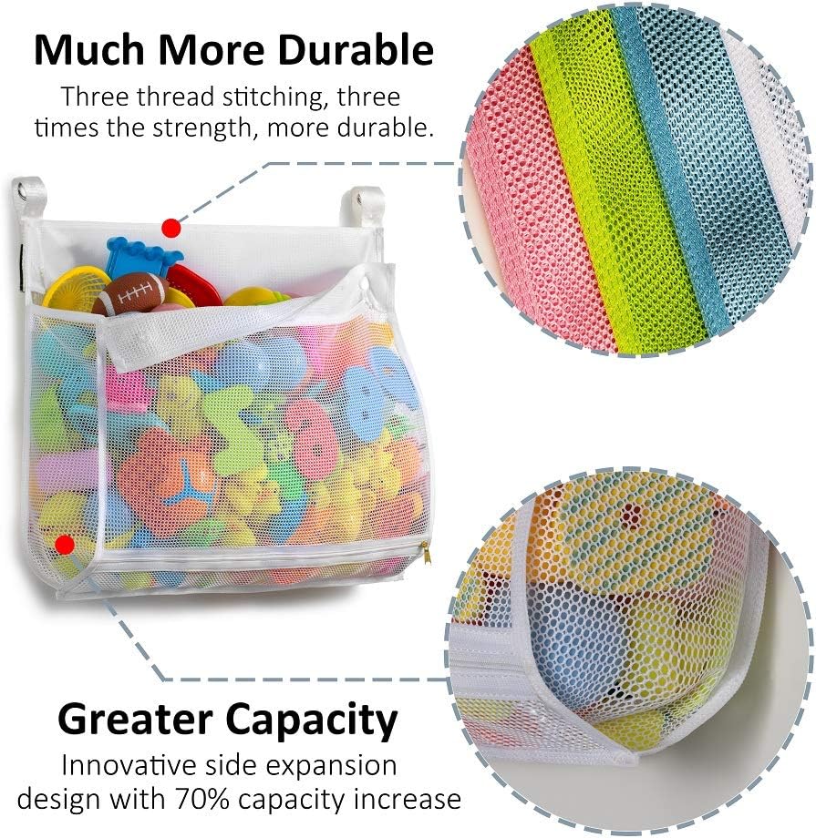 Greater Capacity Our bath toy organizer,Innovative side expansion design with 70% capacity increase,could be used to contain more toys,Save you a lot of space.