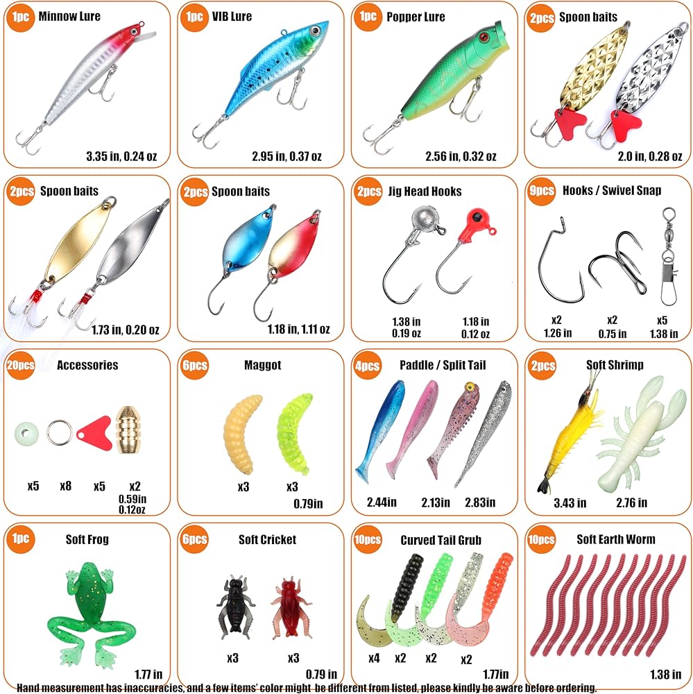 Exaurafelis all-in-one fishing lures kit contains a variety of lures and accessories needed for fishing. It includes different types of lures to attract various fish species. These kits typically comprise hard baits like crankbaits, topwater lures, and soft plastic baits like worms and grubs. They also contain terminal tackle such as hooks, weights, and swivels. An all-in-one kit is convenient for anglers as it provides a comprehensive assortment of lures and accessories in one package, suitable for different fishing conditions and target fish.