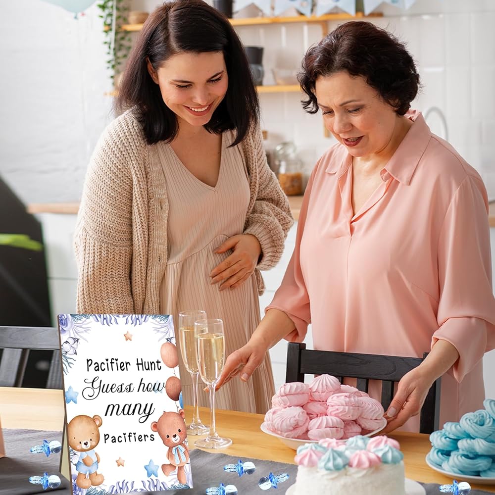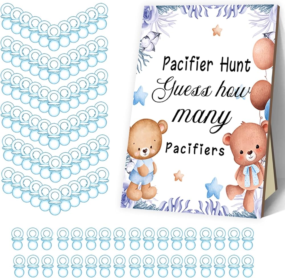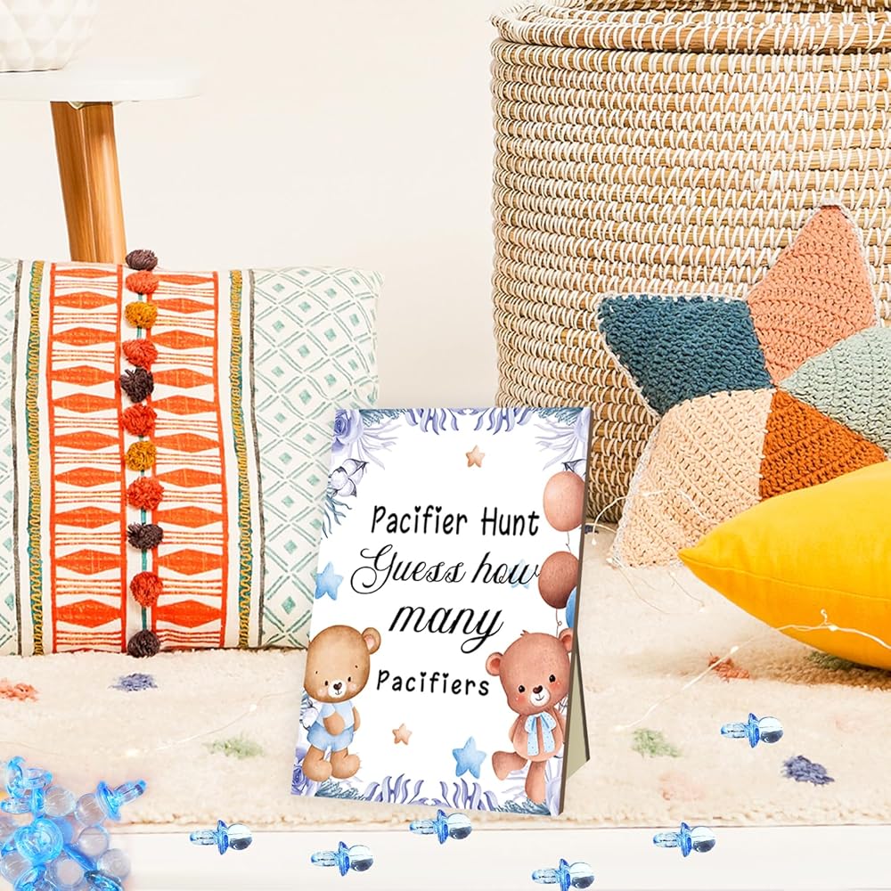 Baby Shower Games, Baby Pacifier Hunt, Include Blue Bear Theme Baby Pacifier Hunt Sign Wooden and 100 Acrylic Baby Pacifiers, Baby Shower Game Gift Set for Boy Girl