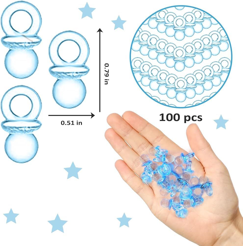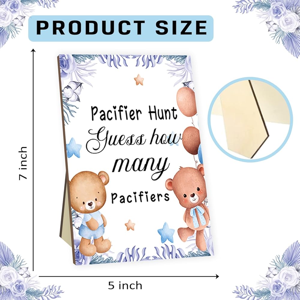 SUFFICIENT QUANY: This set includes a charming Baby Pacifier Hunt Sign made of high-quality wood, adding a touch of rustic elegance to your event. Alongside the sign, you'll find 100 Blue Acrylic Baby Pacifiers, providing everything you need to organize a successful baby shower game.