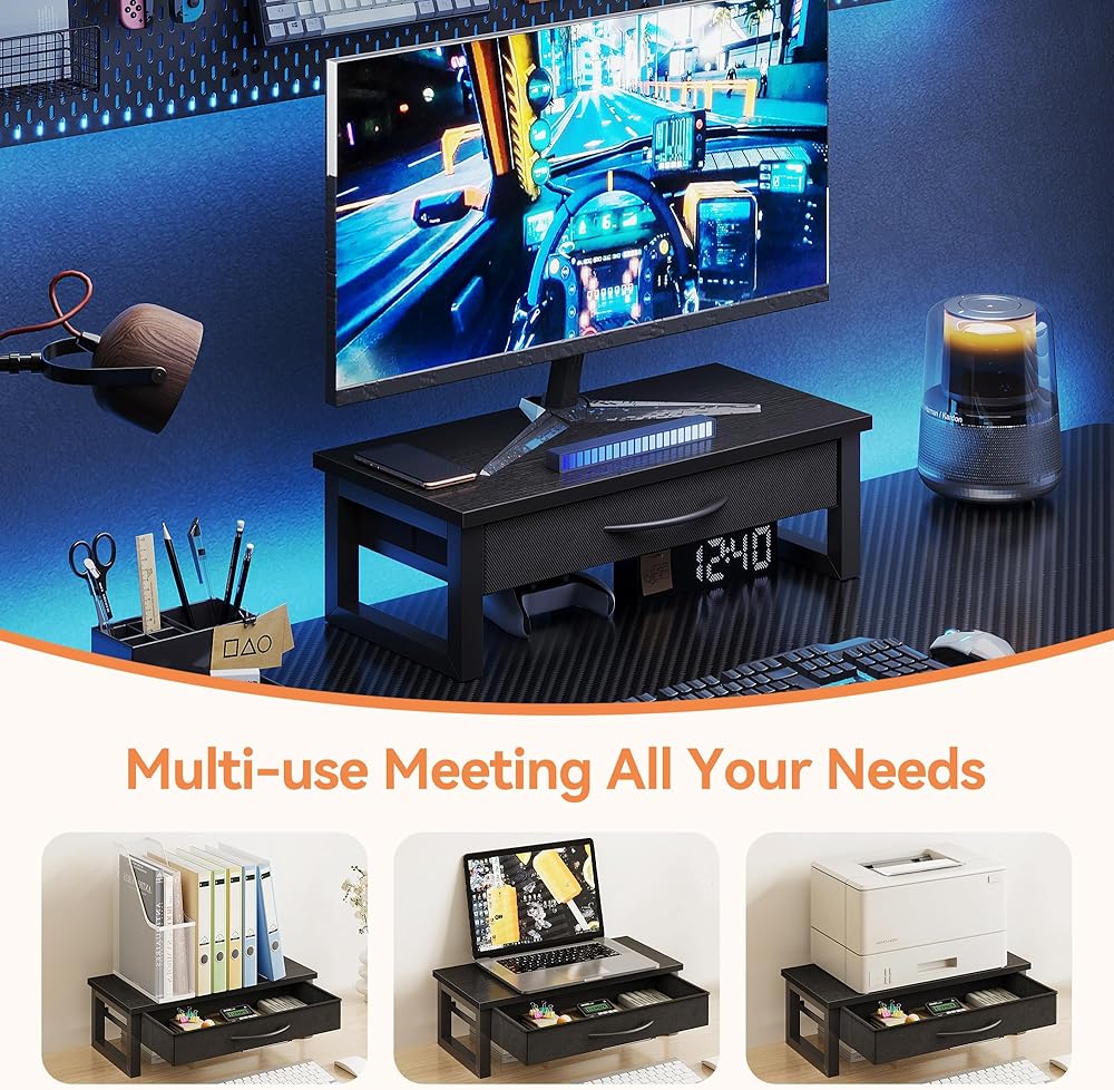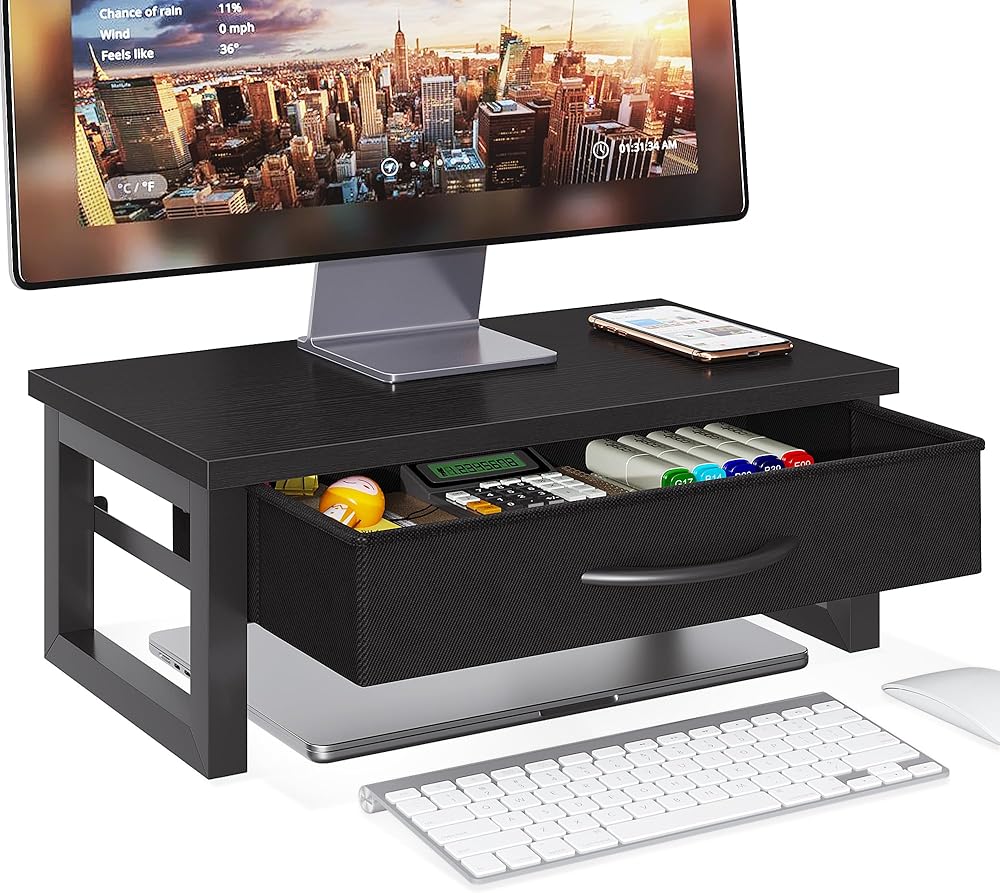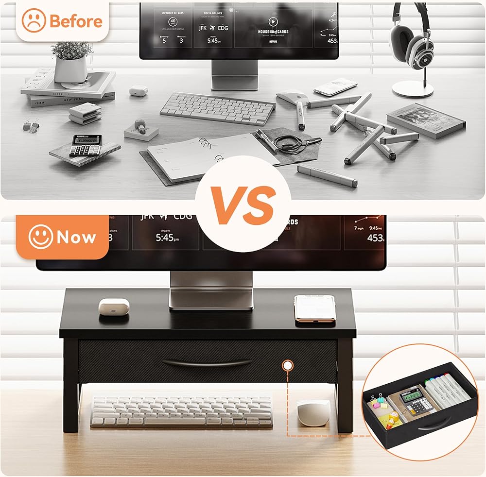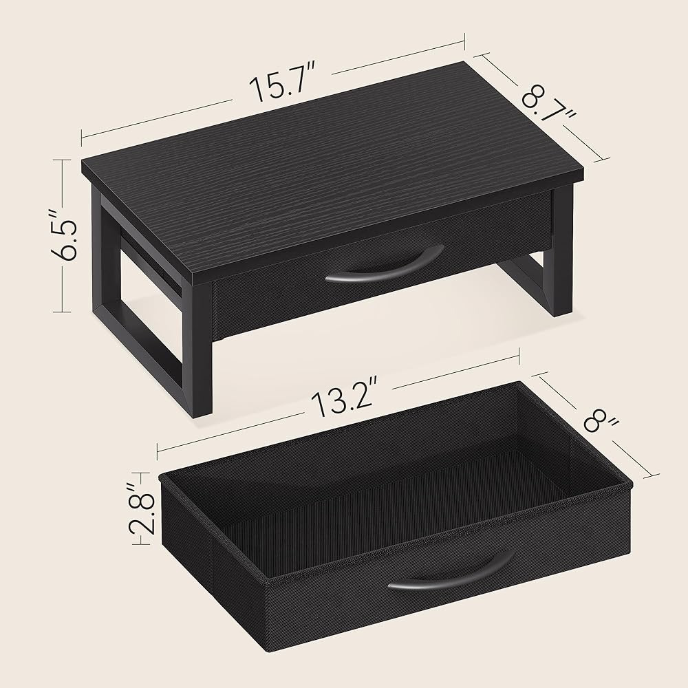 احتفظ بمكتبك (مع درج القماش): يوفر حامل شاشة الكمبيوتر هذا مساحة تخزين كبيرة ؛ سطح المكتب ، درج ، أسفل ، يمكن استخدام جميع لتخزين العناصر ؛ إن وضع العناصر الصغيرة في الدرج سيجعل سطح المكتب بأكمله يبدو أكثر ارتباطًا