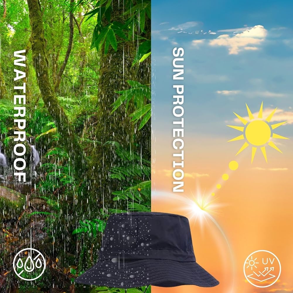 This hat is practical and a comfortable fit! Come rain or shine, this bucket hat will protect you! On rainy days, it keeps your head and hair dry.On sunny days, it reduces UV damage to your skin. The band width is adjustable as is the sting that adjusts under the neck to resist the wind. It is very lightweight,has a hook,can be stored anytime and anywhere,very suitable for traveling, hiking, seaside... It has a stylish and simple shape, and it can be worn with any outfit.
