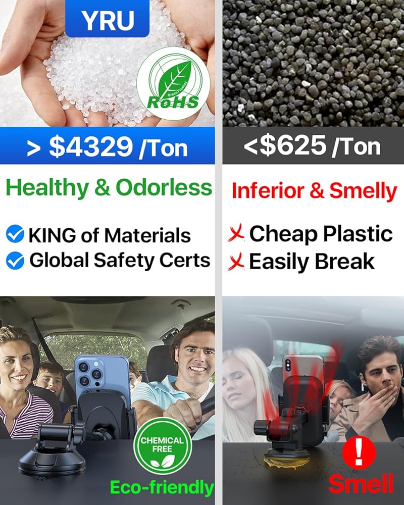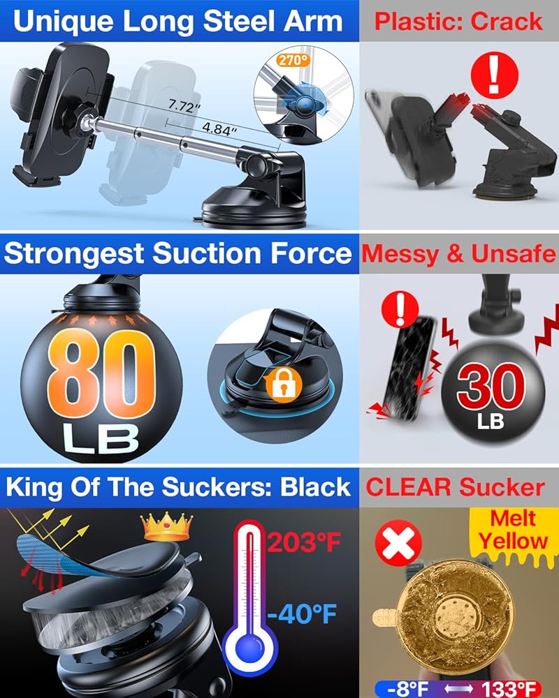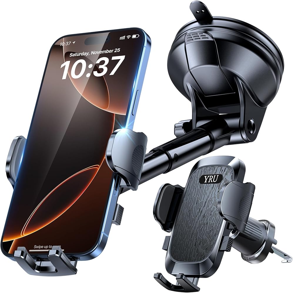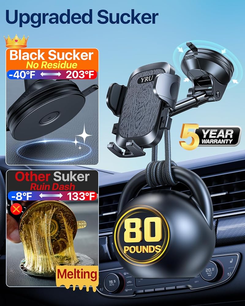 YRU True Military Grade Car Phone Holder Upgraded Strongest Rotatable Suction Cup Cell Phone Mount for Dashboard Windshield, Truck Cradle Dash Stand for iPhone 17 16 Pro Max 15 14 13 Android, Black
