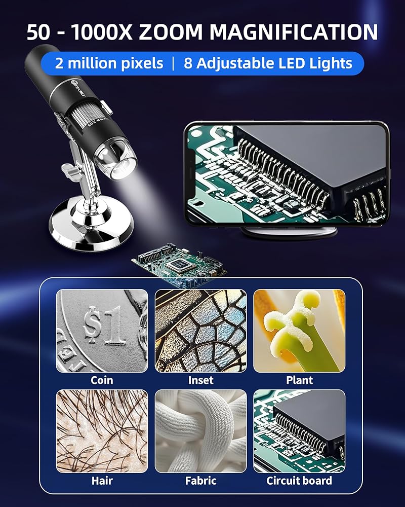【A Funny Tool】: This electronic microscope is more of a fixed focus digital magnifying glass with light, not a traditional microscope, Not suitable for professional serious biologists! This is definitely a very interesting microscope for kids, parents, adults, teachers, students, children, collectors, testers, electronics' repair folks, and inquisitive folks who are interested in exploring skin hair scalp trichomes and the microscopic world