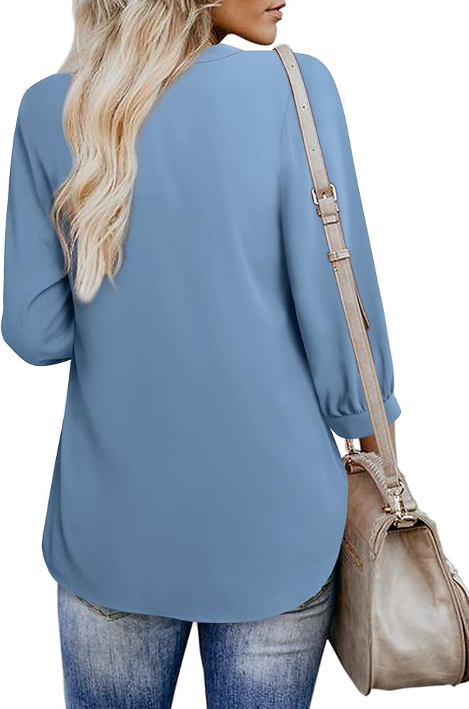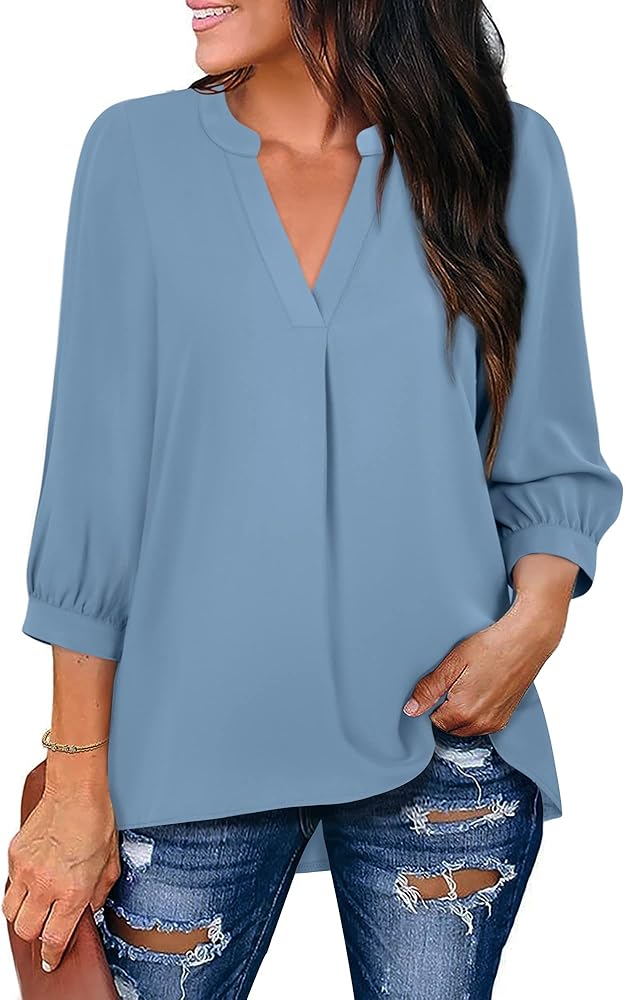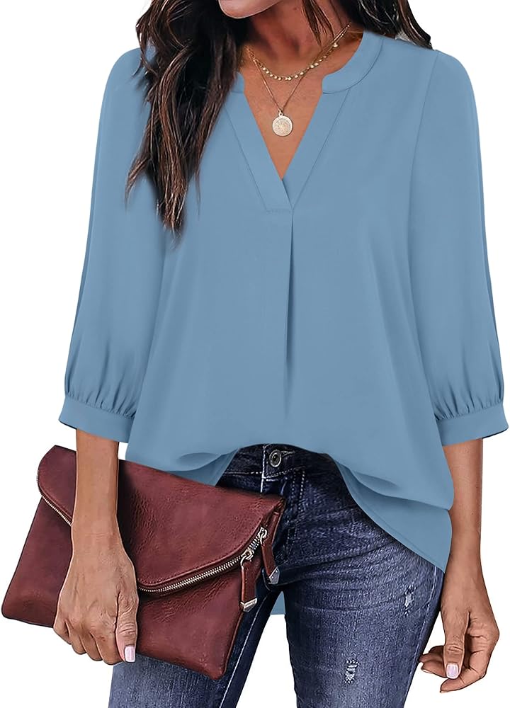 الميزات - فستان بلوزة بأكمام 3/4 / قمصان رسمية / قمصان عمل برقبة على شكل حرف V / نمط تونيك مرتفع ومنخفض / بلوزات شيفون / ملابس ملابس مكتبية / سترة نسائية بطول تونيك / أمامية مطوية