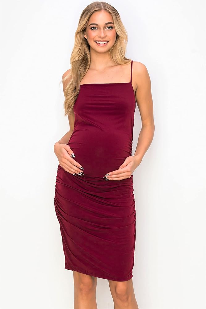 التصميم - يتميز هذا الفستان بتصميم رقبة مربعة وجوانب مكشكشة، وهو يحتضن منحنياتك في جميع الأماكن الصحيحة ويبرز بطنك المتنامي. مصمم خصيصًا ليكون بسيطًا وأنيقًا ولكنه مريح ومكمل خلال جميع مراحل الحمل