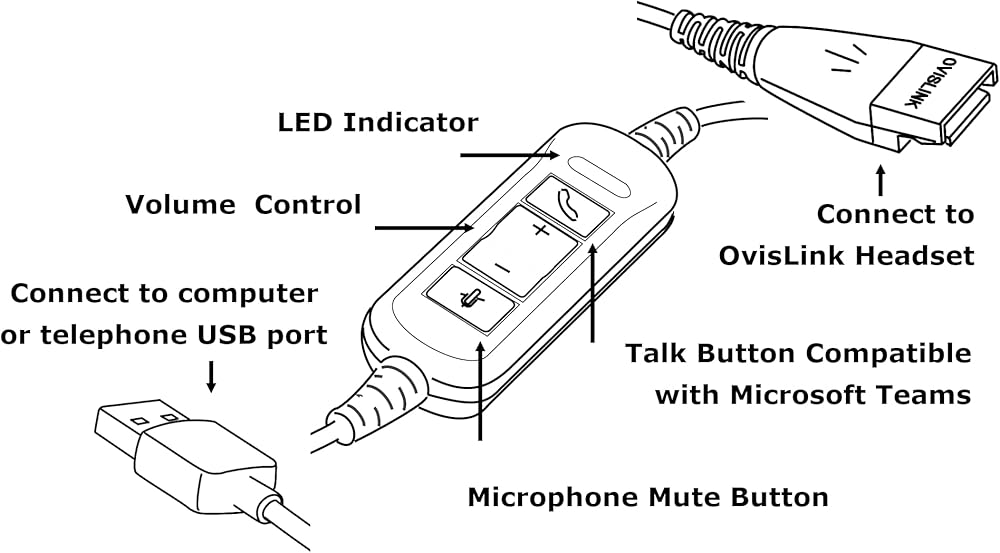 OvisLink OVHS072-USB, Call Center headset with Noise Cancelling and USB Quick Disconnect cord. Compatible with Microsoft Teams, apps installed on computer. This USB Call Center headset is compatible with Windows, Mac, Linux, Android and apps like Zoom, Skype, Google Meet. Quick disconnect cord function not only gives you convenience to disconnect the headpiece from the bottom cord that you don't have to unplug and plug the headset to your computer every day. It also let you to use the headset with different devices. For example, replace the USB Quick Disconnect cord with a RJ9 Quick Disconnect cord or a 2.5mm Quick Disconnect cord to use the headset with different desktop phones.