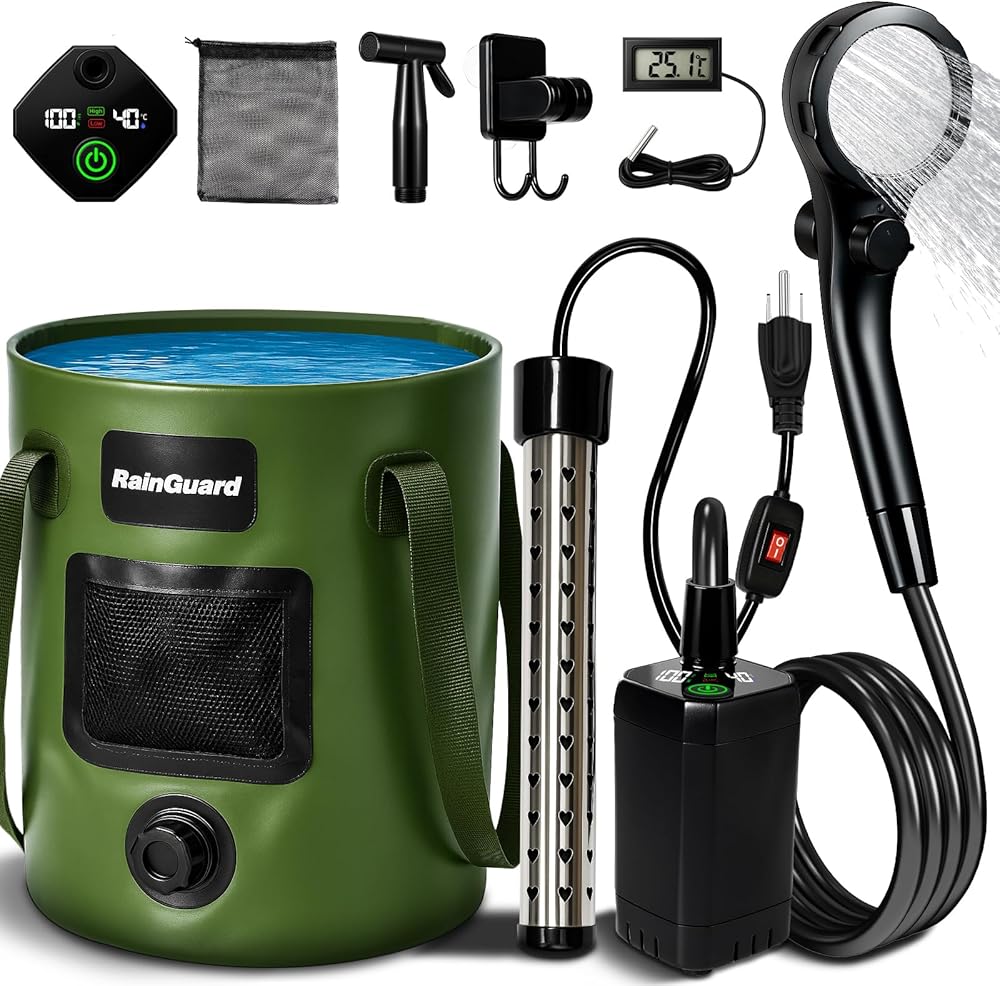 DOVIVEKIT ™ المحمولة دش التخييم | 6.6 جالون دلو قابلة للطي ، مضخة دش 6000 مللي أمبير في الساعة ، رأس دش 6 '7 بوصات ، سخان 1500 واط غمر ، شاطئ الصيف في الهواء الطلق الاستحمام المشي لمسافات طويلة حمام غسل سيارة غسل السيارة