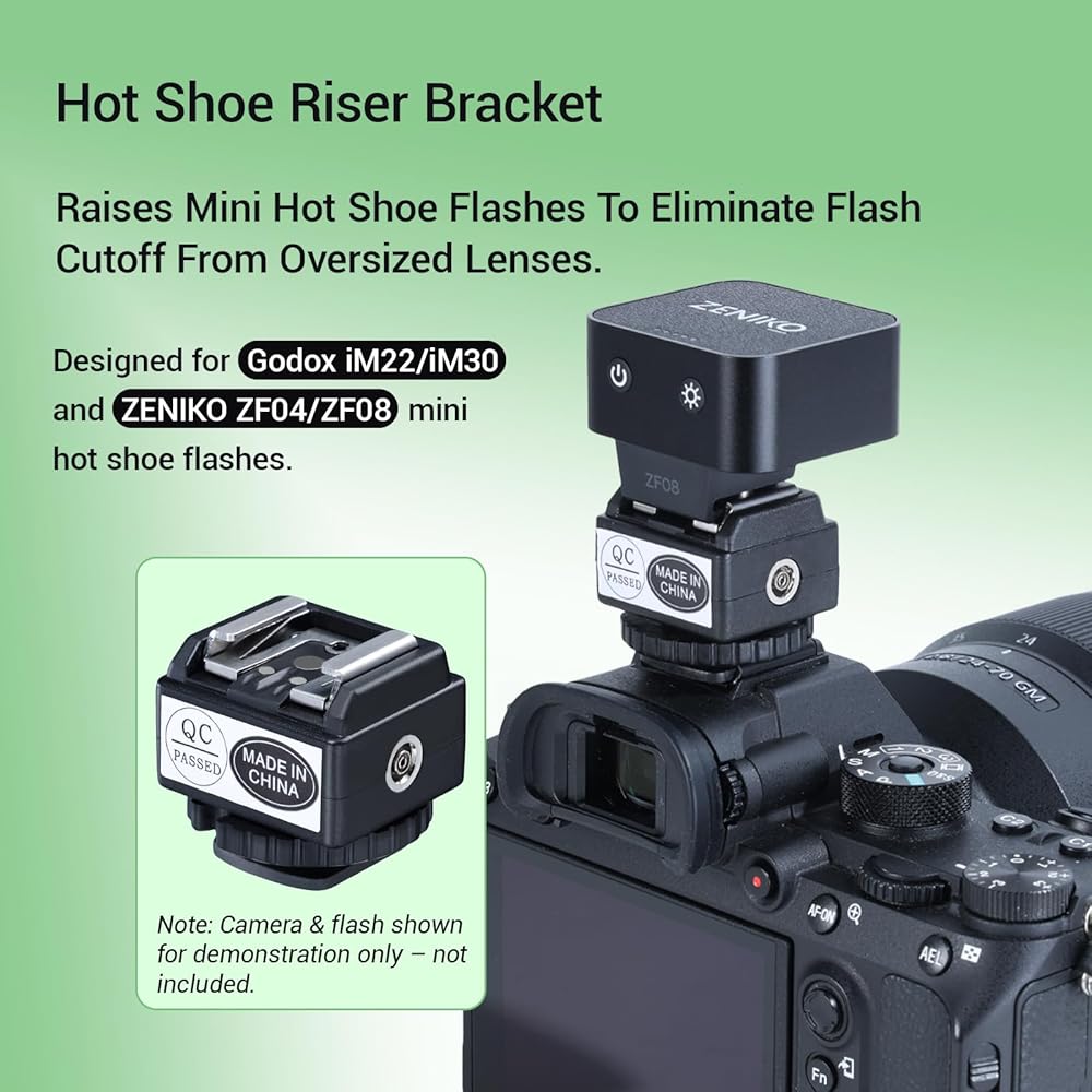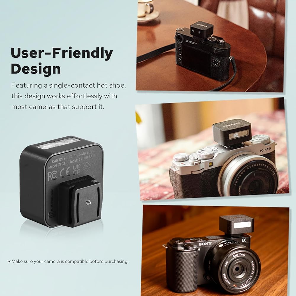 ZF08 MINI FALSH Light Camera Small Flash مع حذاء Hot Flash C-N2 ارتفاع المقعد لزيادة Canon/Fuji/Sony ZV1/Sony ZVE10/Nikon/Panasonic Olympus Pentax/3S Recycle (أسود)