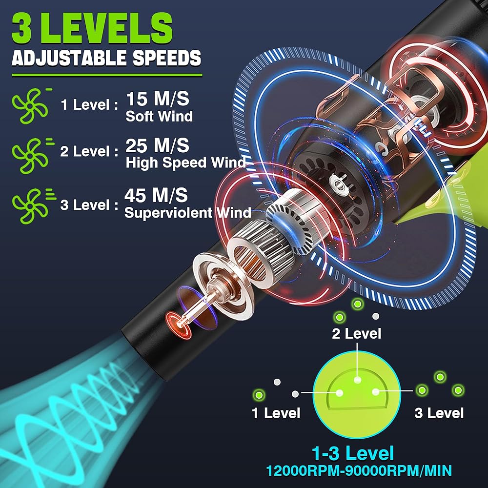 ⚡ 【عالي السرعة 90،000 دورة في الدقيقة محرك توربو】 مصمم من أجل إزالة الغبار والحطام الفعال ، يولد هذا المنفاخ اللاسلكي تدفق هواء قوي لتنظيف لوحات المفاتيح ، والتصميمات الداخلية للسيارات ، والعتاد في الهواء الطلق ، والالكترونيات. مثالي للصيانة السريعة دون متاعب من الحبال أو علب الهواء المضغوطة.