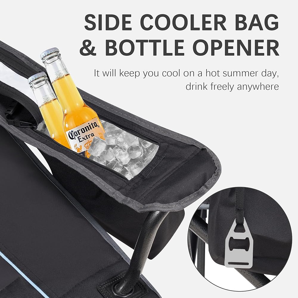 【مساحات تخزين إضافية】 يتميز كرسي التخييم بحقيبة أكثر برودة تناسب ستة علب 200 مل التي تحتفظ بالجليد لساعات. تم تجهيز الطاولة الجانبية لكرسي المعسكر القابل للطي بحامل كوب مقاوم للانسكاب ، وفتحة الهاتف وجيب جانبي متعدد الوظائف ، ويحافظ على تنظيم أساسيات لأيام الشاطئ أو حفلات الباب الخلفي. بالإضافة إلى أن فتحات الزجاجة المتكاملة تبقي أساسيات منظمة لأيام الشاطئ أو حفلات الباب الخلفي - لا مزيد من البحث عن الأدوات لفتح المشروبات