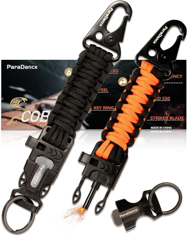 【5-In-1 Survival Keychain】- Our heavy duty survival keychain features 5 basic outdoor survival tools [1 x loud whistle, 1 x flint rod, 1 x flint striker, 1 x key ring, and 550 paracord]. They look like unassuming little tools, but please don't underestimate them, they may save your life at some point. So whether you're on an outdoor adventure or in your everyday life, let it be with you.