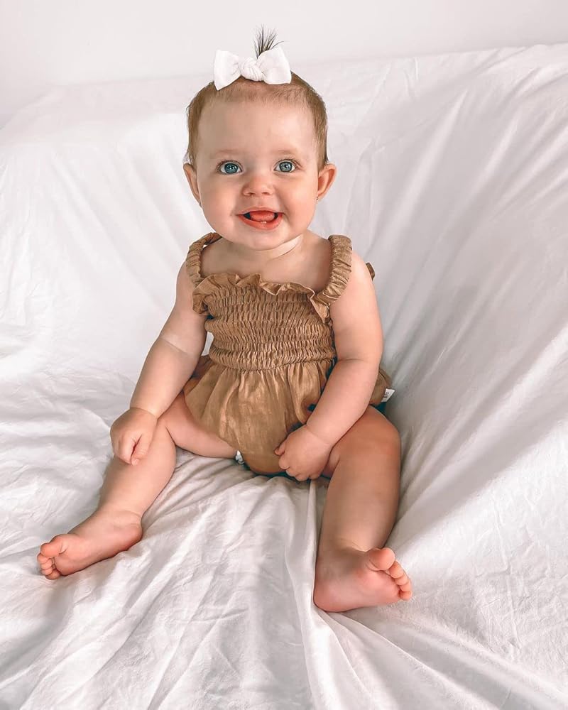التصميم: بدلة قفز بلون سادة للفتيات حديثي الولادة، تصميم مكشكش أنيق حول الصدر، سهل الارتداء، مجموعة رومبر بدون أكمام، تصميم حبال رائع للصيف، بدلة أساسية من الكتان القطني بلون سادة، مع عصابة رأس لطيفة على شكل فيونكة.