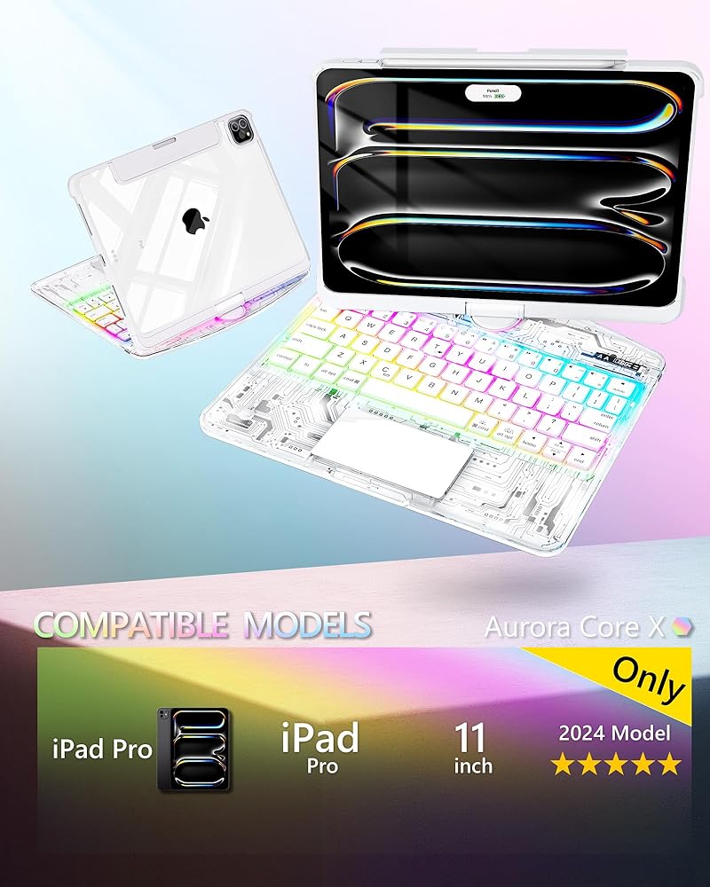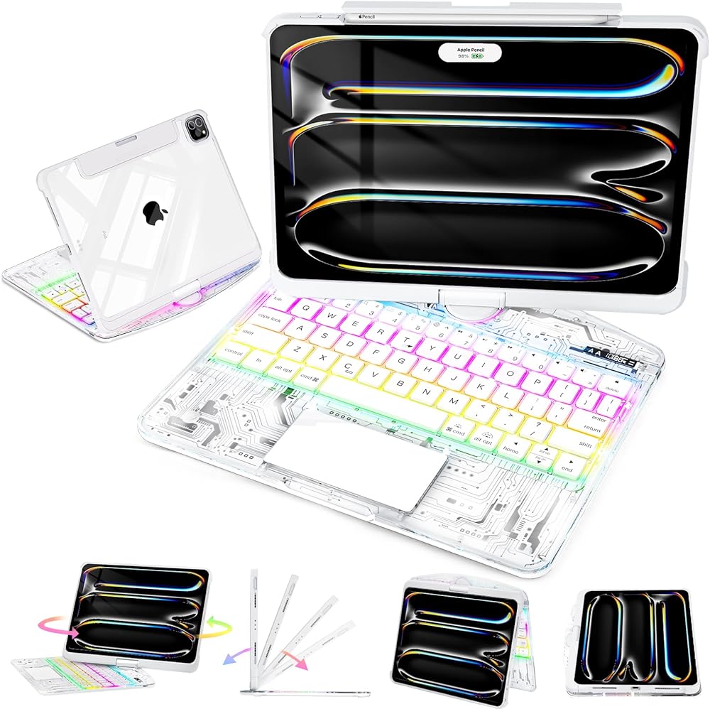 حالة لوحة المفاتيح لـ iPad Pro 11 بوصة (M4 ، 2024) ، قذيفة Cyberpunk شفافة ، لوحة تتبع متعددة اللمسات 360 درجة ، لوحة مفاتيح خلفية 7 ألوان ، شحن Type-C ، Core Core X