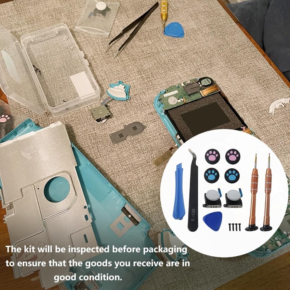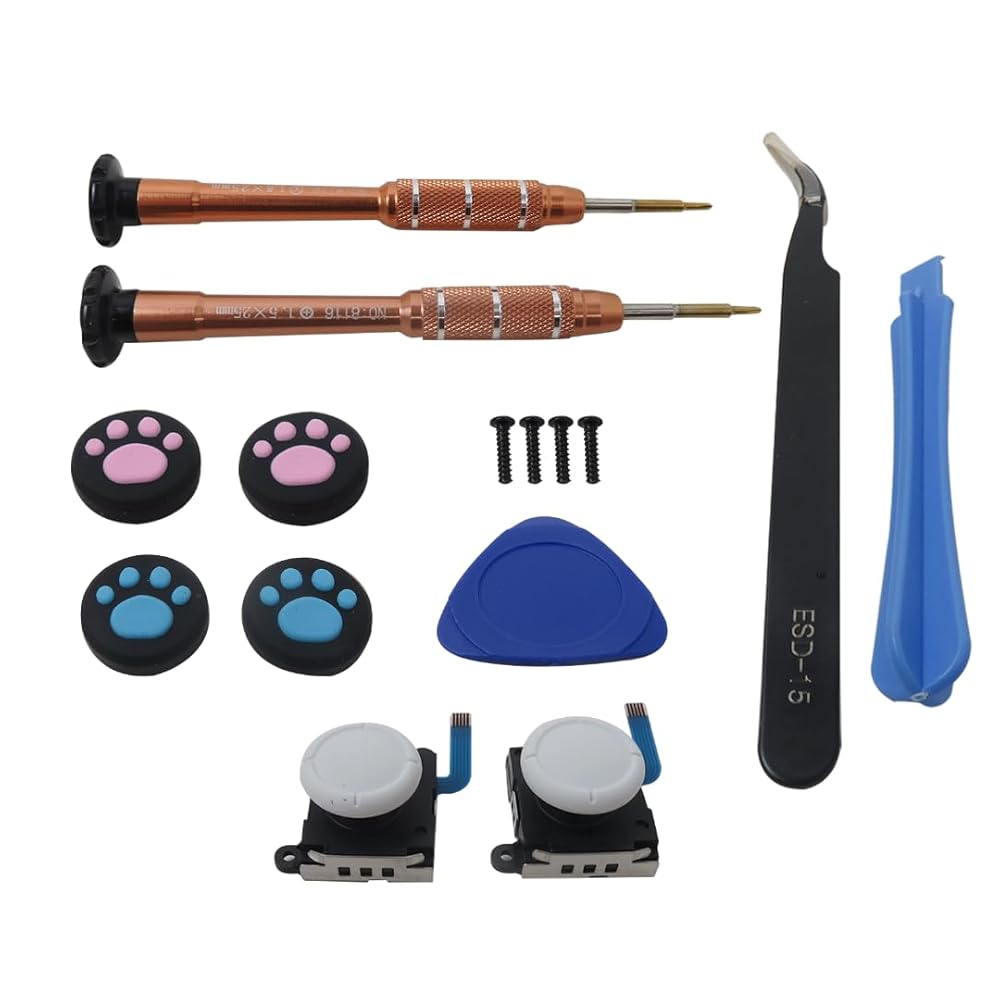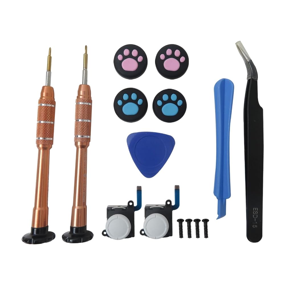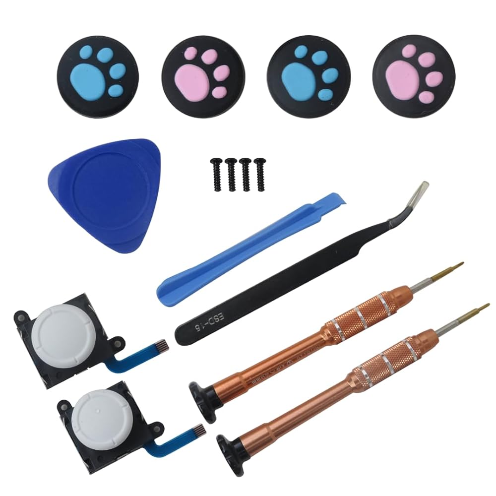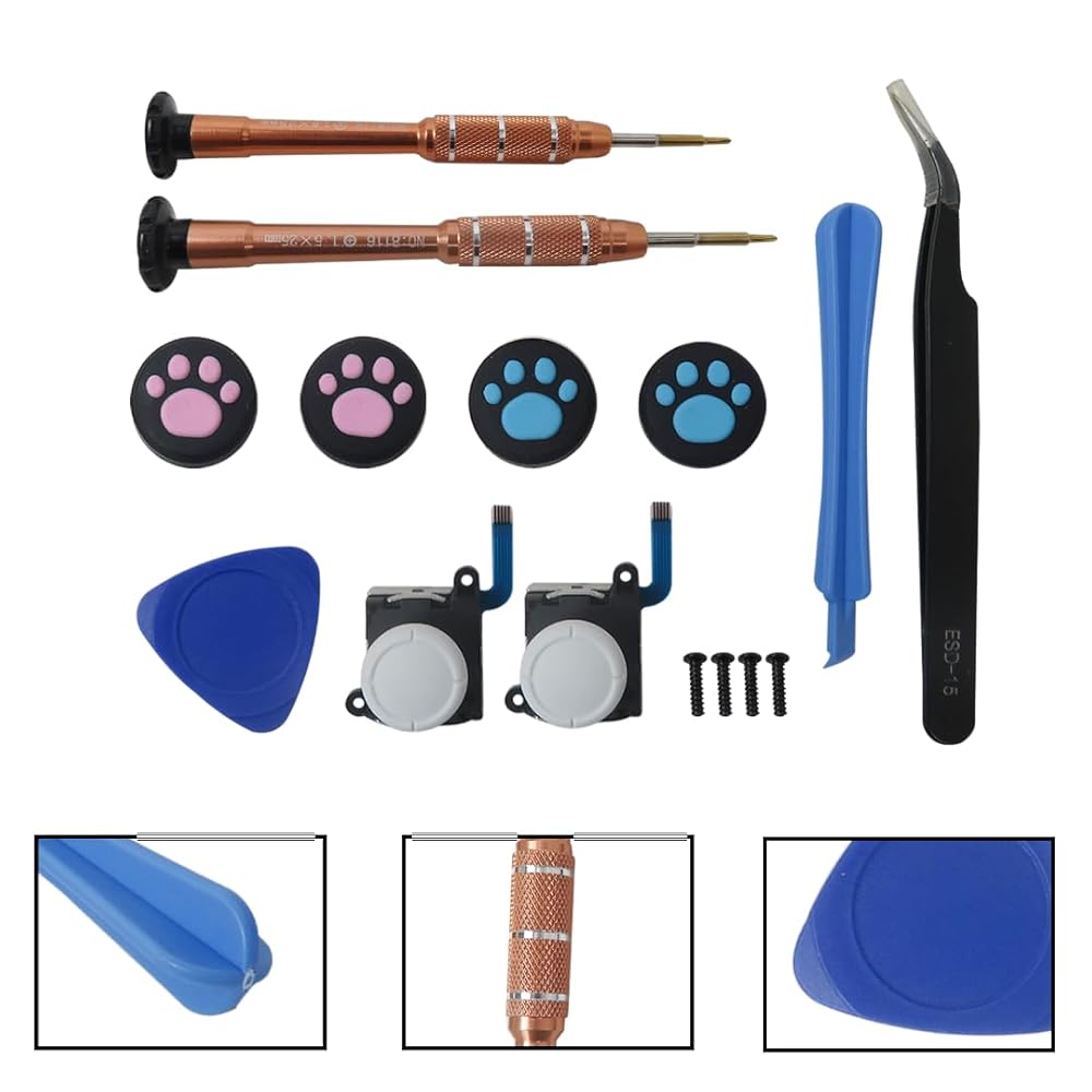• Package Content: 2x Thumbstick Joystick, 1x Y1.5 Screwdriver, 1x +1.5 Screwdriver, 1x Plastic Spudger, 1x Triangle Plectrum, 1x Tweezers, 4x Thumbstick Caps, 4x Y Screws as pictured;;