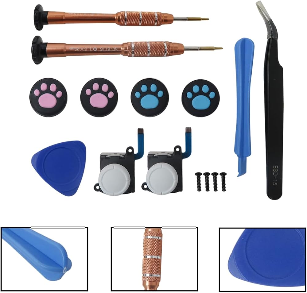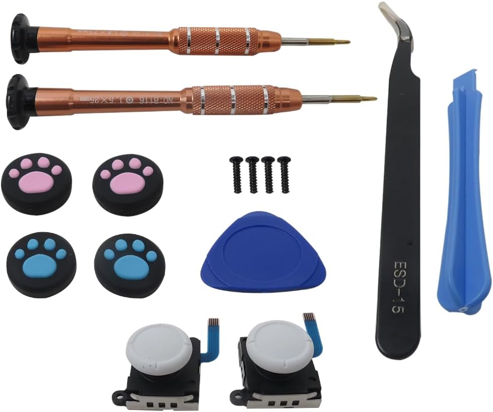 • Package Include: 2x Thumbstick Joystick, 1x Y1.5 Screwdriver, 1x +1.5 Screwdriver, 1x Plastic Spudger, 1x Triangle Plectrum, 1x Tweezers, 4x Thumbstick Caps, 4x Y Screws as pictured;