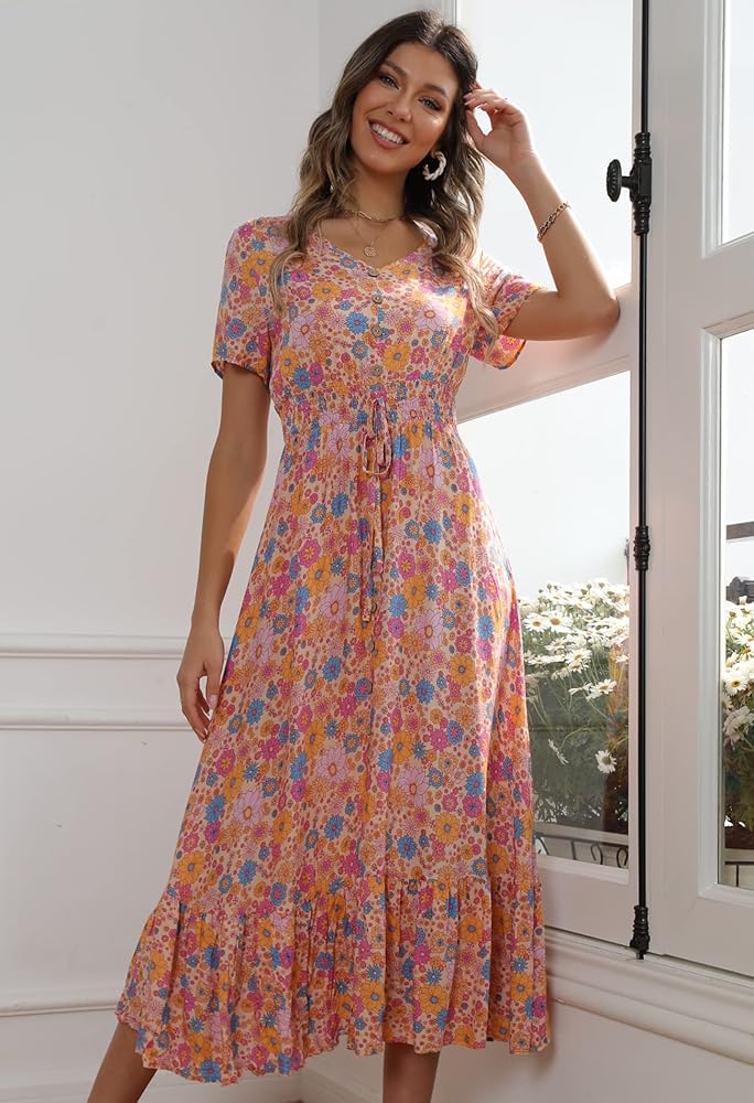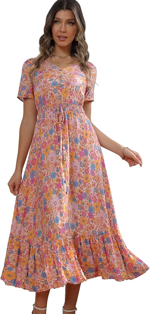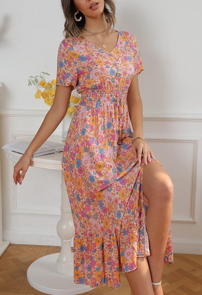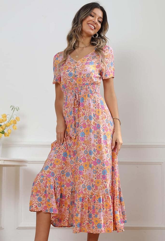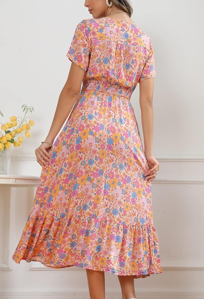 • السمات: خط رقبة على شكل حرف V، أزرار سفلية من الأمام، خصر إمبراطوري مرن، طباعة زهور، حاشية متأرجحة مكشكشة.