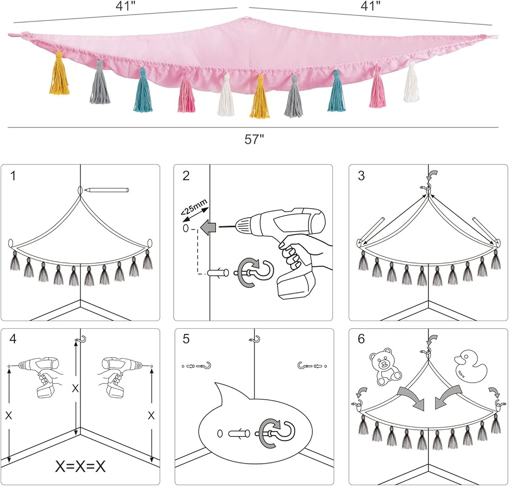 سهلة التركيب: تأتي مع الخطافات والأظافر الملولبة الضرورية. أرجوحة تخزين الألعاب سهلة التركيب في زاوية الغرفة (باتباع تعليمات التثبيت الموضحة في الصورة الأخيرة).